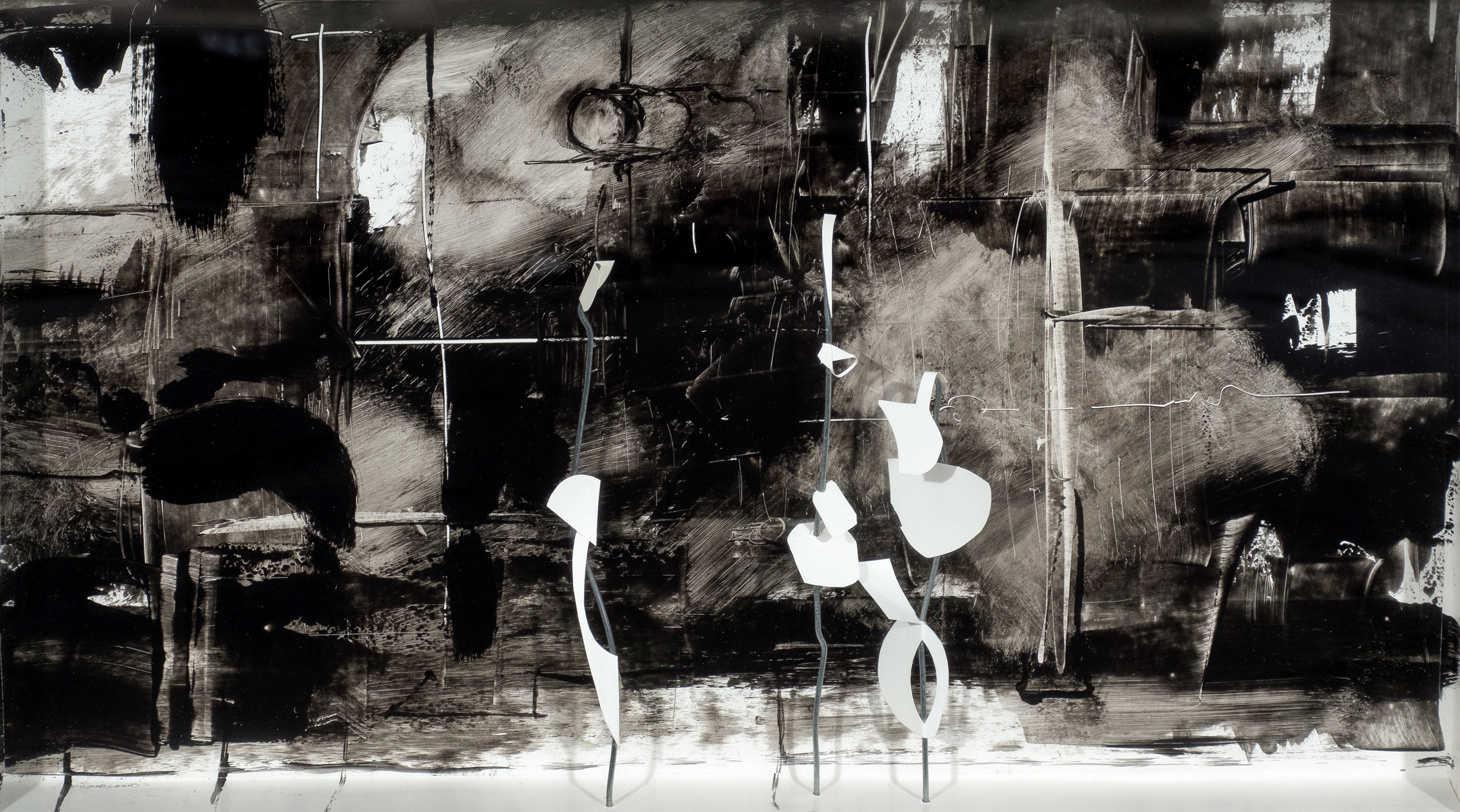 White card and steel against a painted backdrop and within an integral white wooden frame