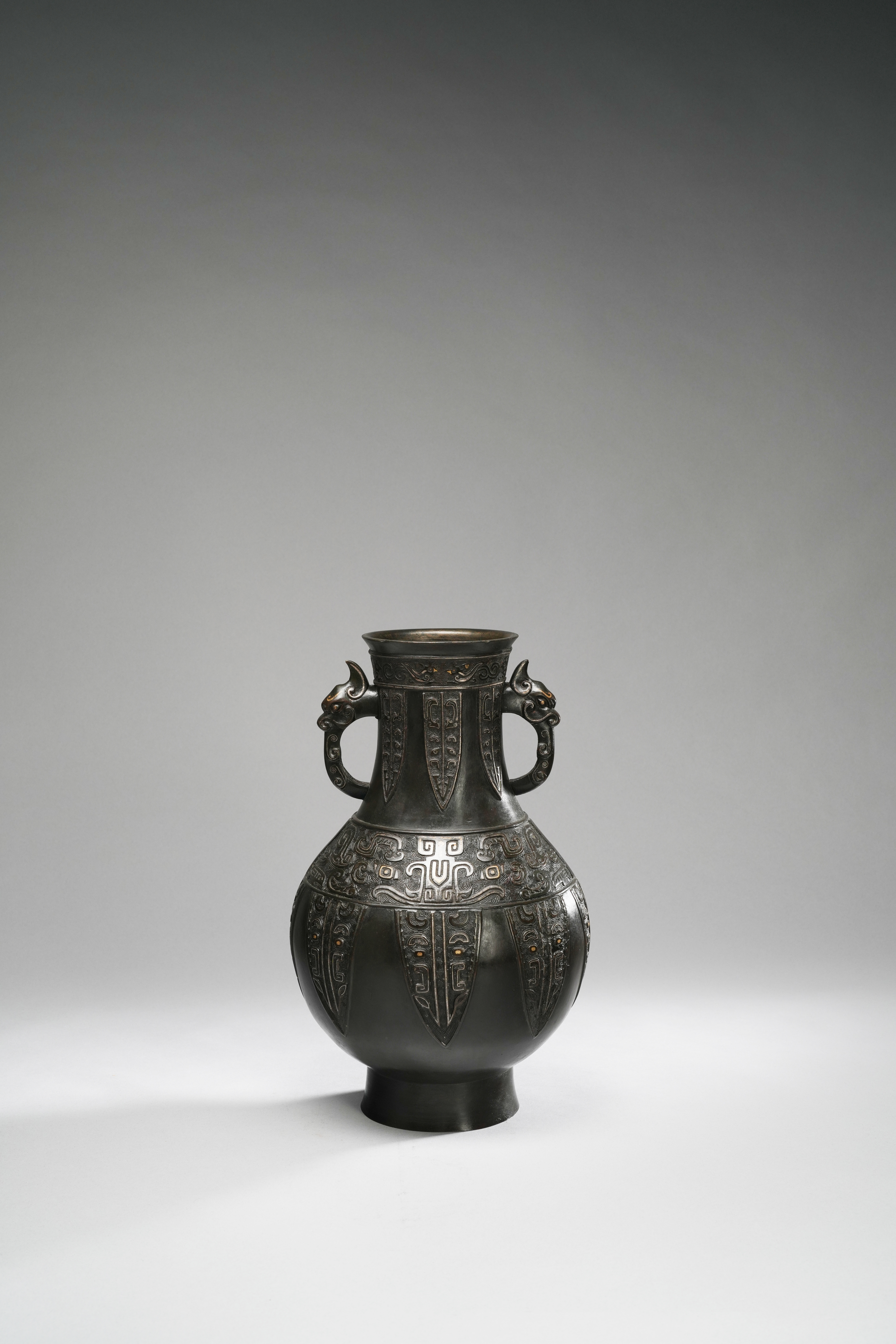 The body cast with stylised lappets and set with animal-mask loop handles to the neck, 3.1kg, 35cm.