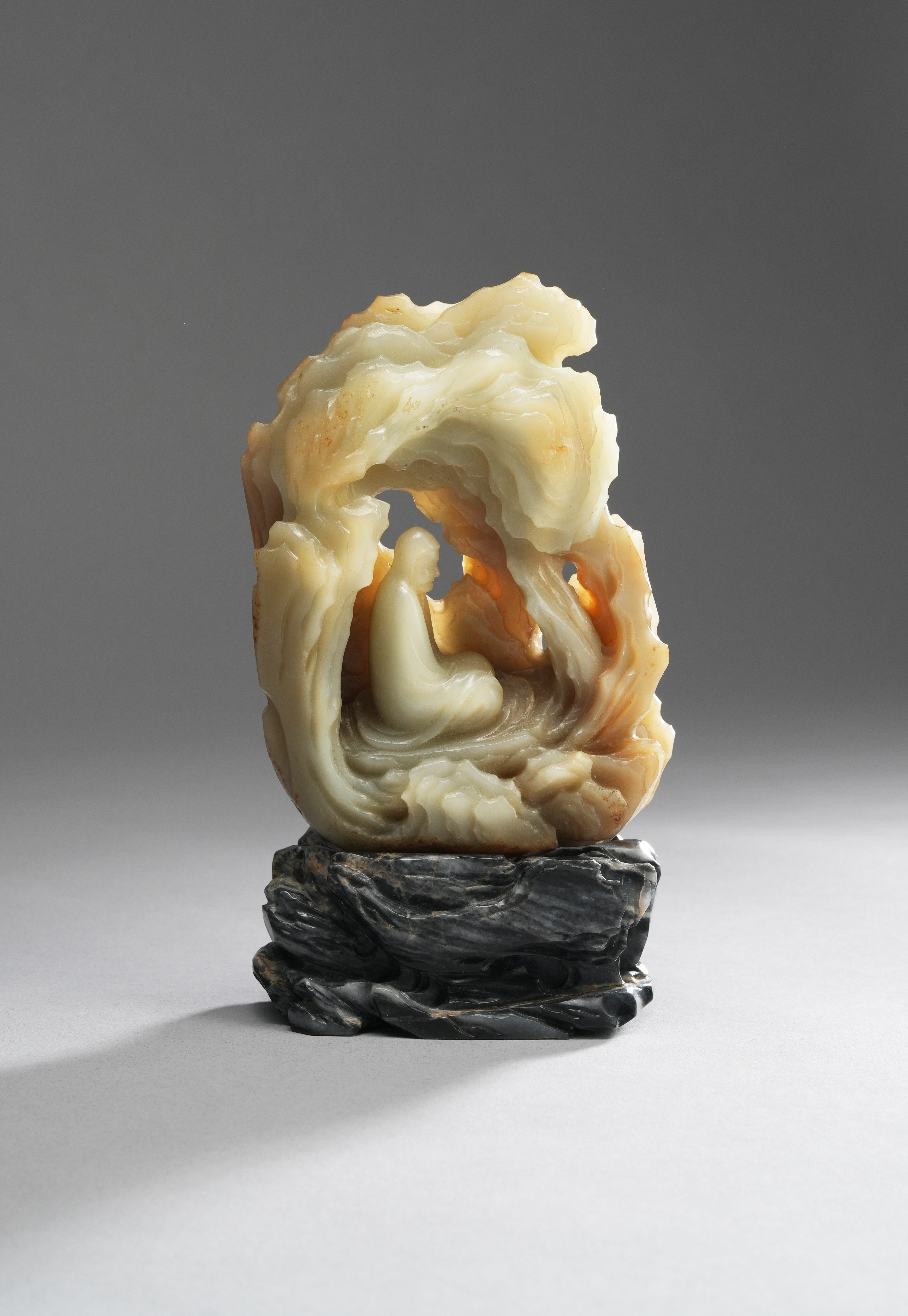 Carved with a kneeling monk in a mountain cave, the separate base in a grey stone with pale striations, 16cm overall. (2)