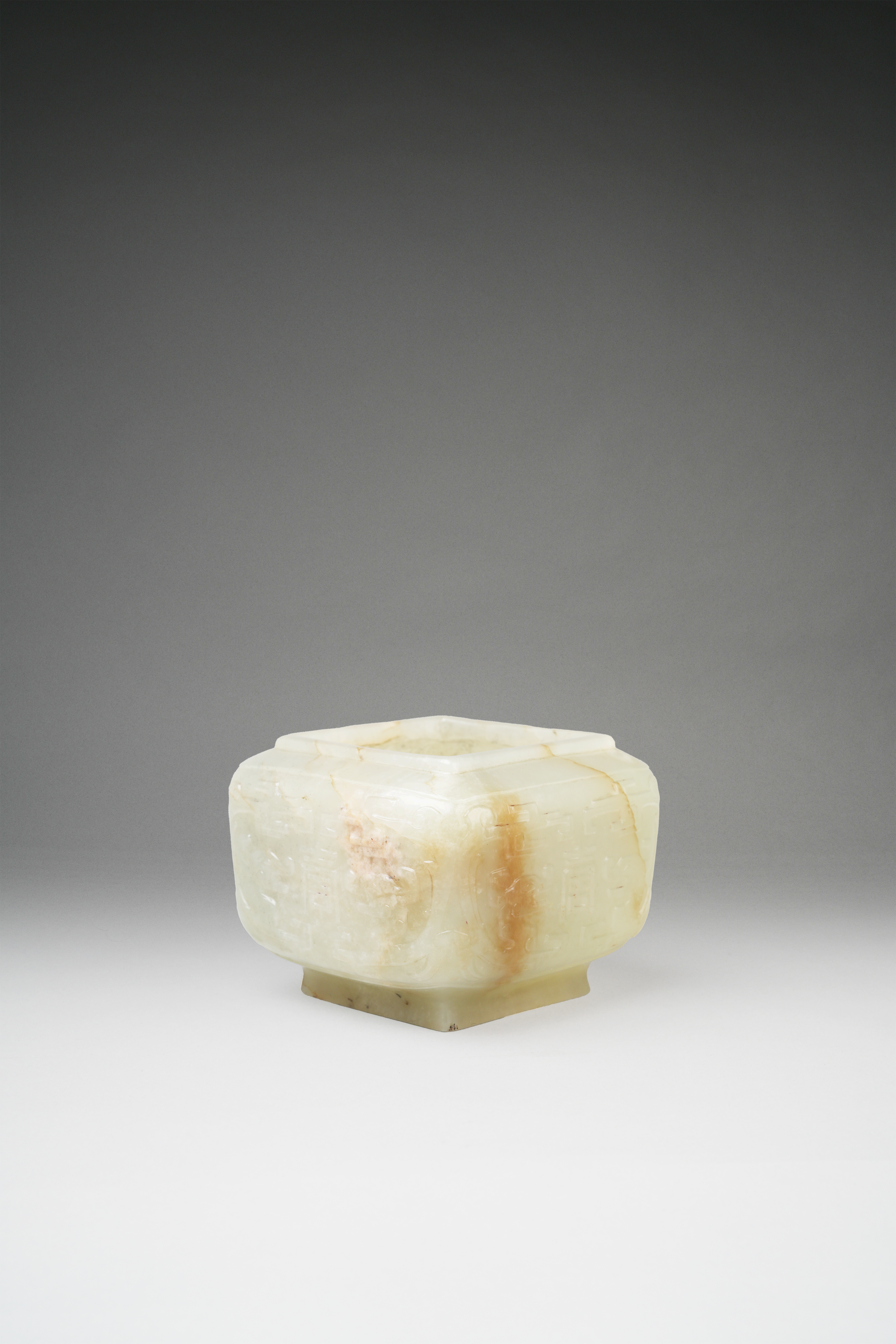 A CHINESE CELADON JADE ARCHAISTIC SQUARE WATERPOT