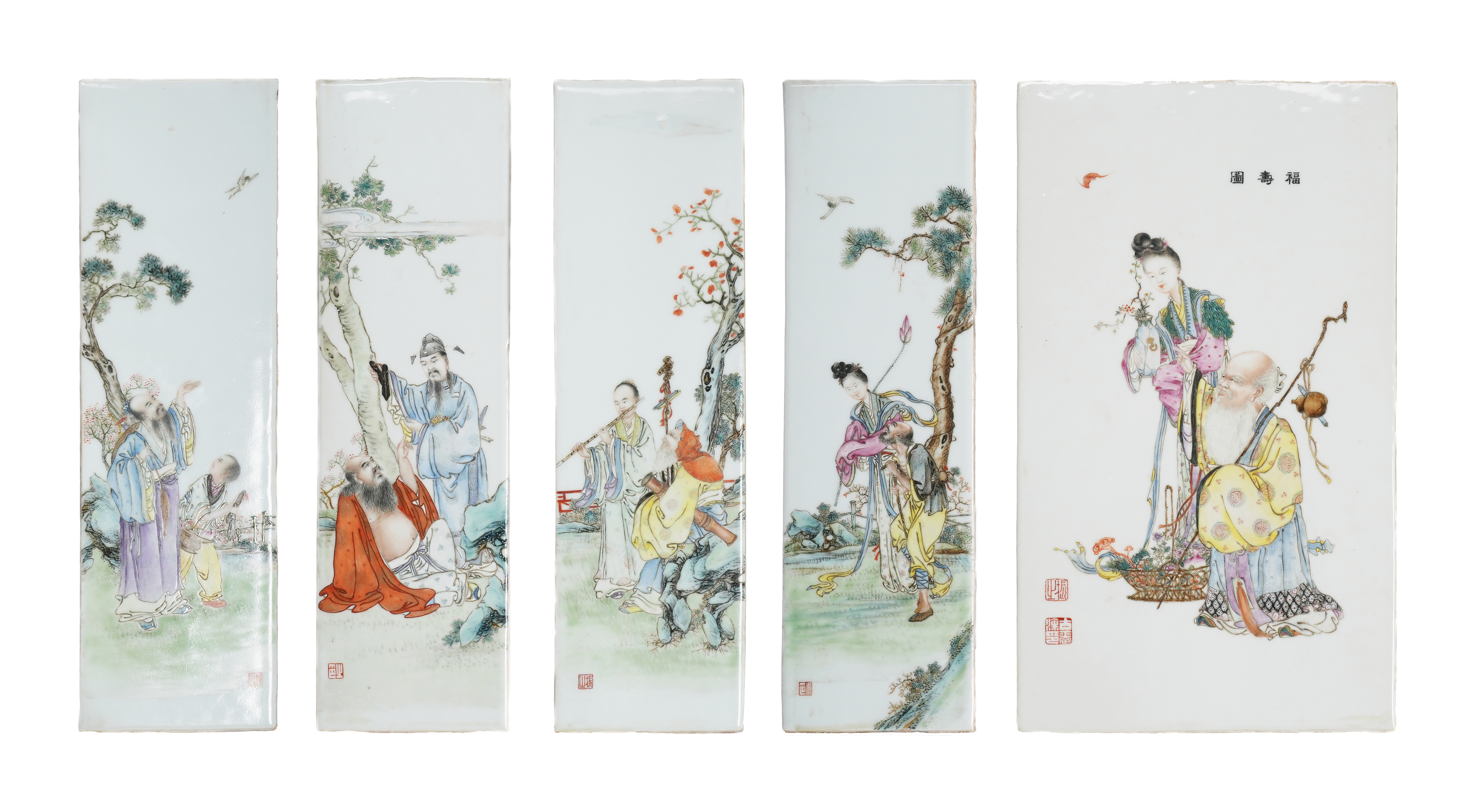 FIVE CHINESE FAMILLE ROSE 'SHOULAO AND IMMORTALS' PANELS
