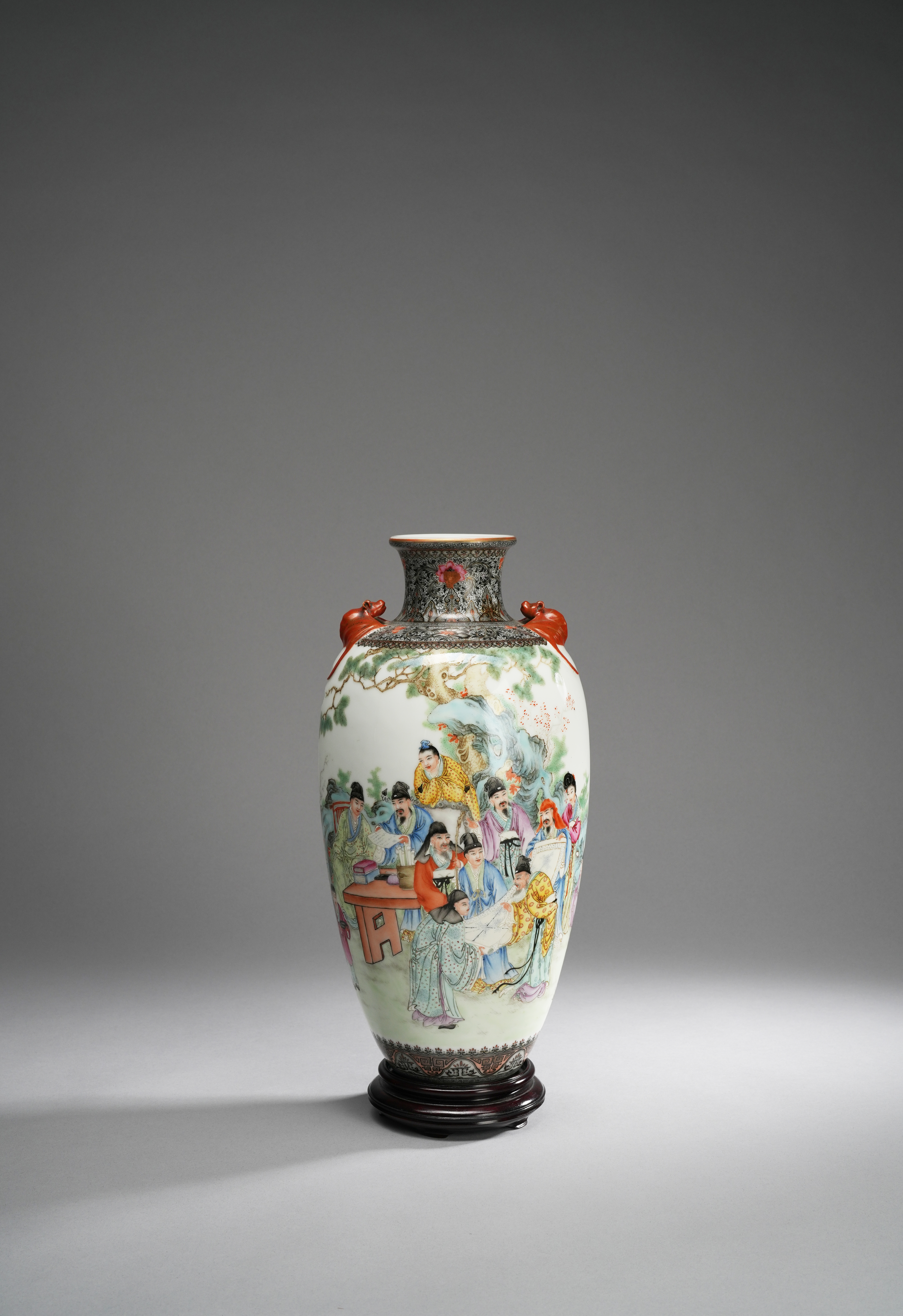 The ovoid body applied with iron-red bats to the shoulder and brightly decorated with a group of scholars and their attendants beneath a pine tree, the reverse with an inscription and four seal marks, with a wood stand, 34.5cm. (2)