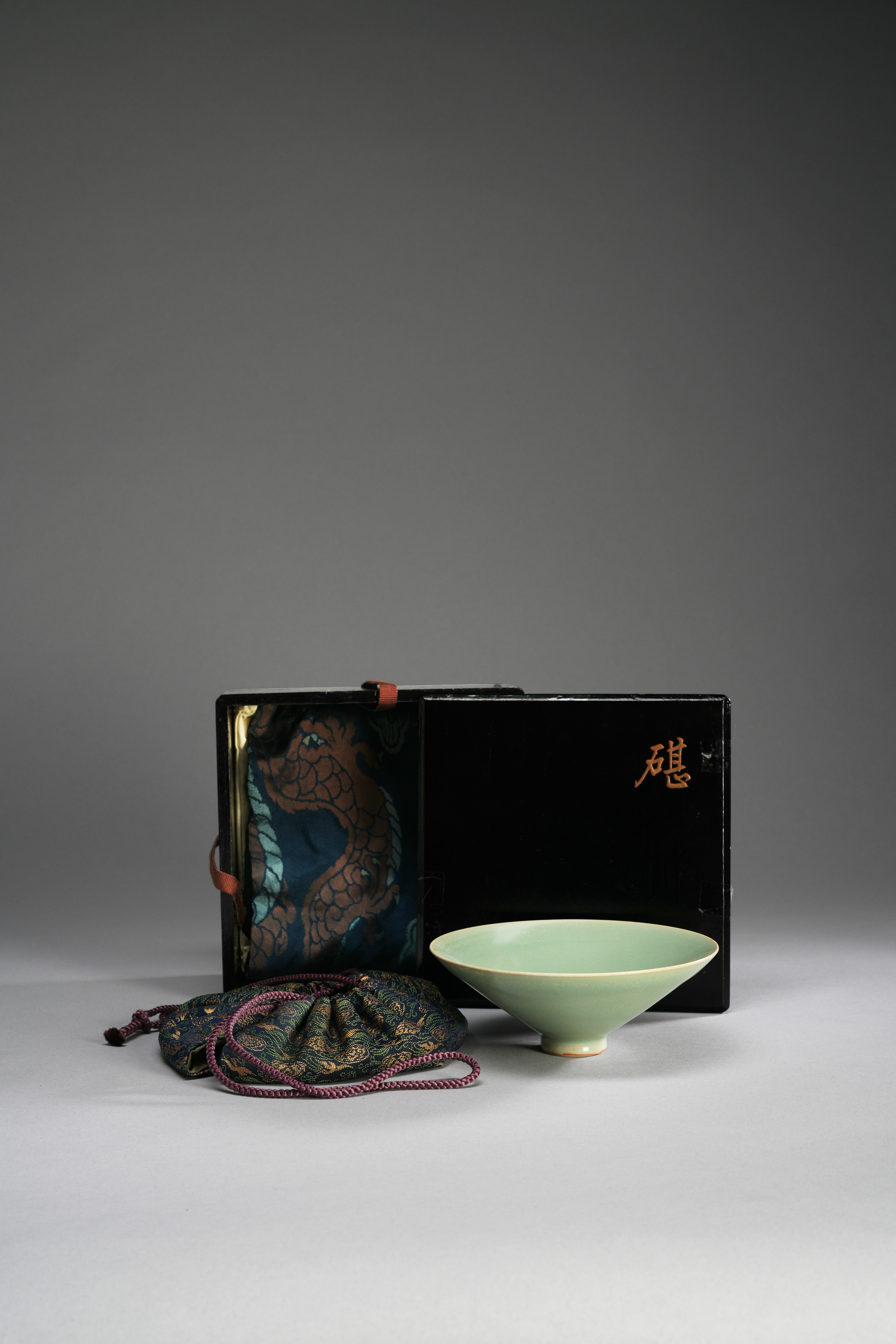 The shallow conical bowl rising from a short straight foot, covered overall in an unctuous blue-green glaze pooling to a deeper blue at the interior well and thinning at the rim, with a silk drawstring bag and a Japanese lacquered wood box, 15.1cm.
