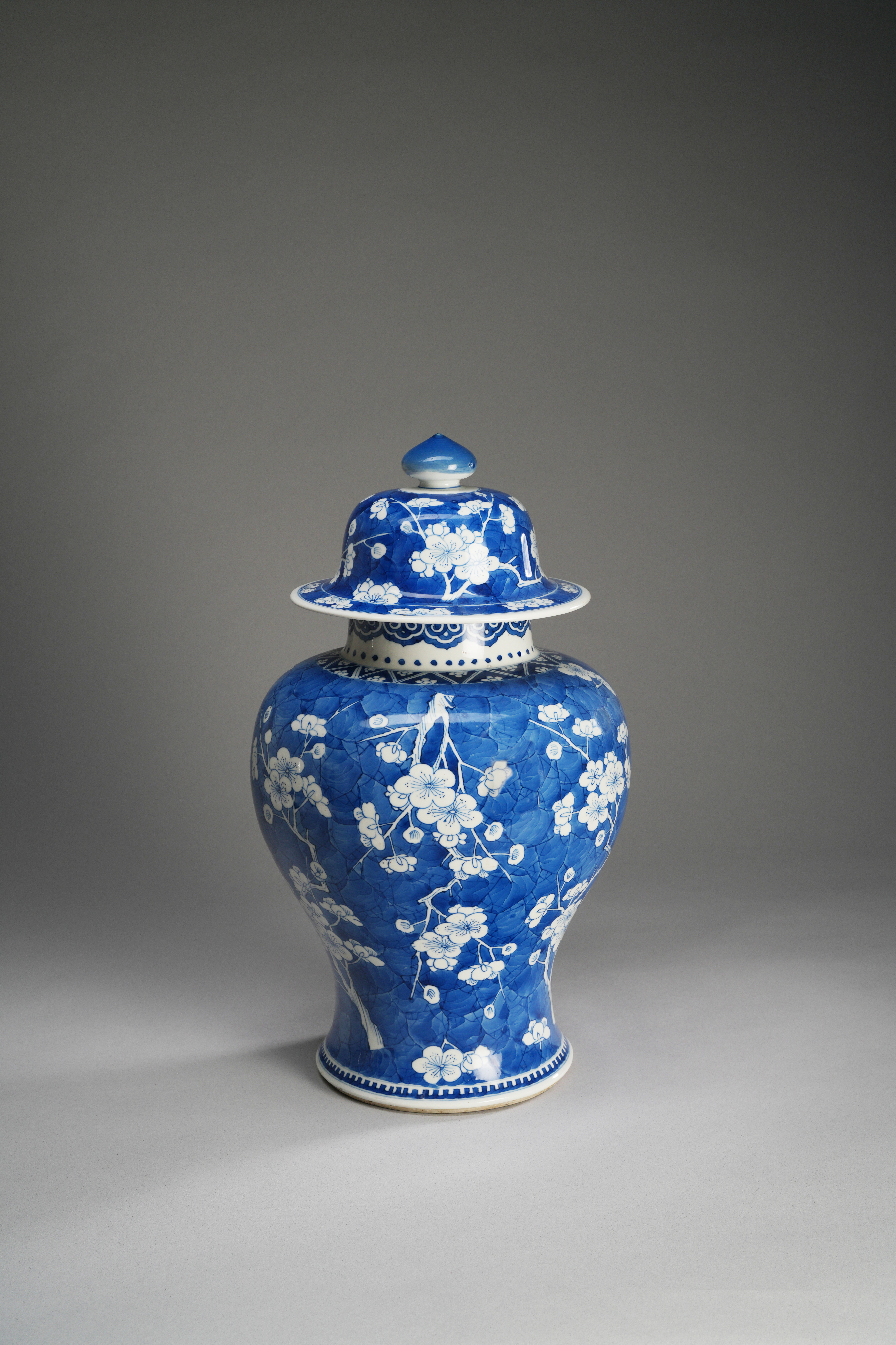 Decorated with flowering prunus branches on a cobalt blue cracked-ice ground, 44cm. (2)