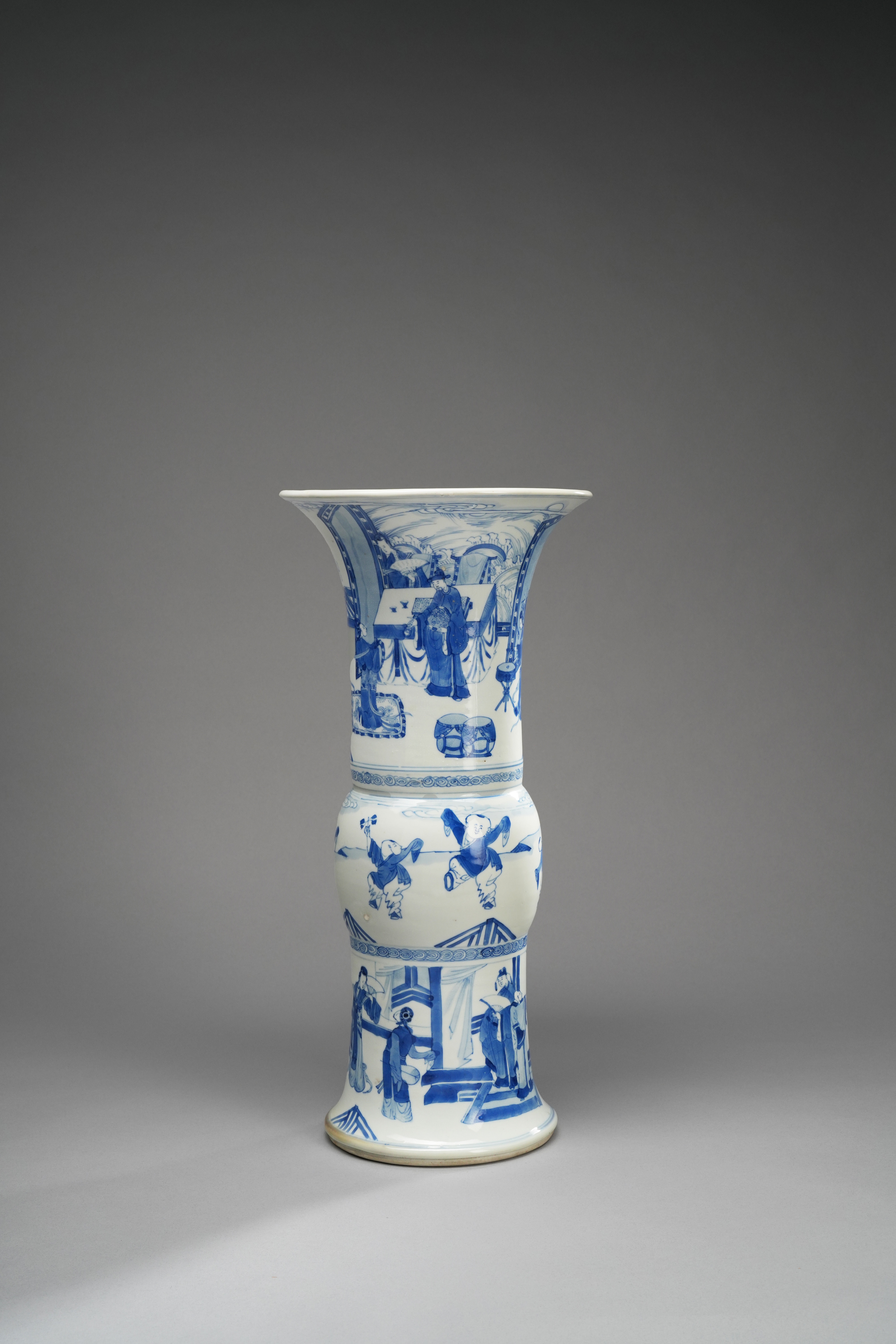 A CHINESE BLUE AND WHITE GU-SHAPED 'ROMANCE OF THE WESTERN CHAMBER' VASE