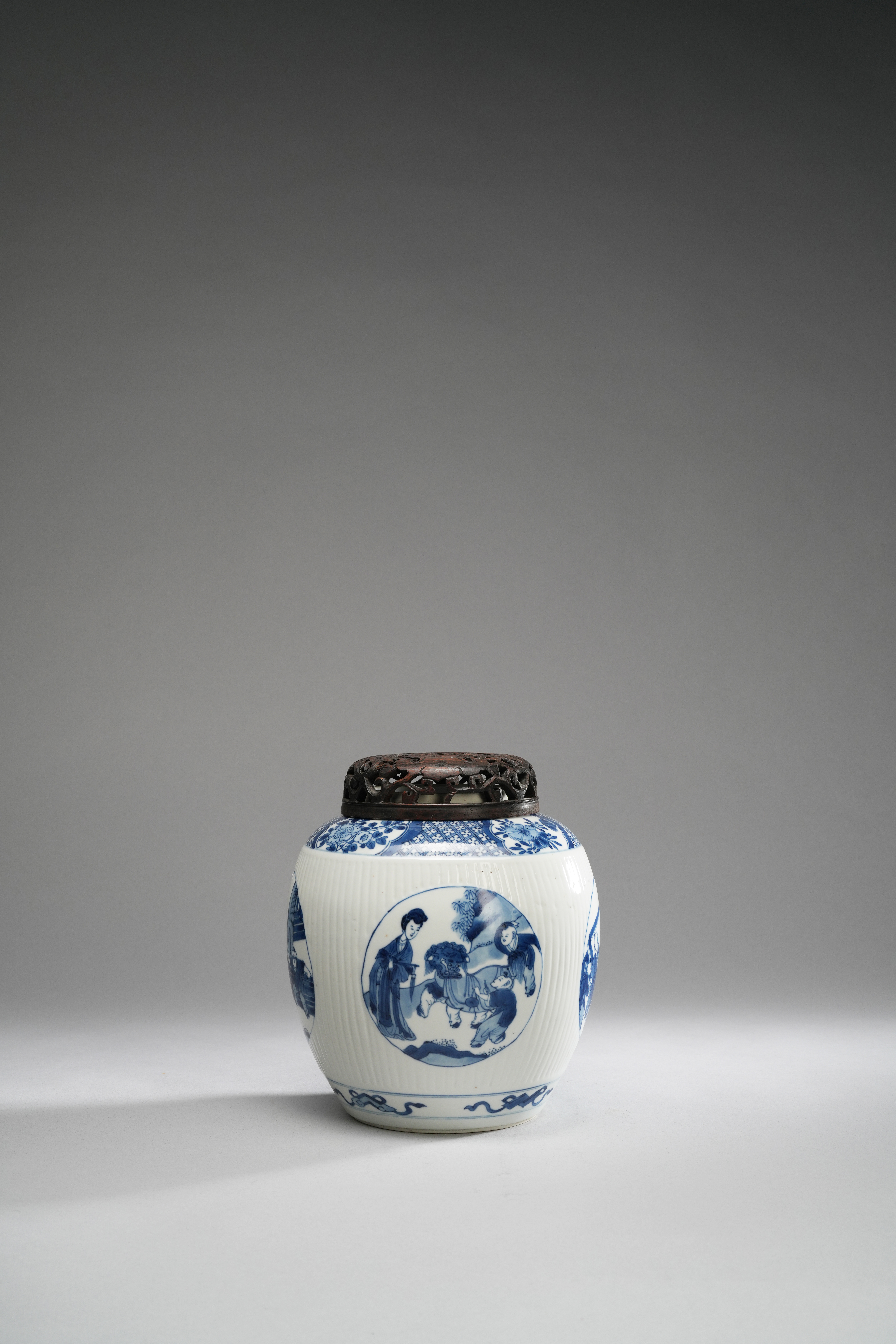 A CHINESE BLUE AND WHITE RIBBED 'LADIES AND BOYS' JAR