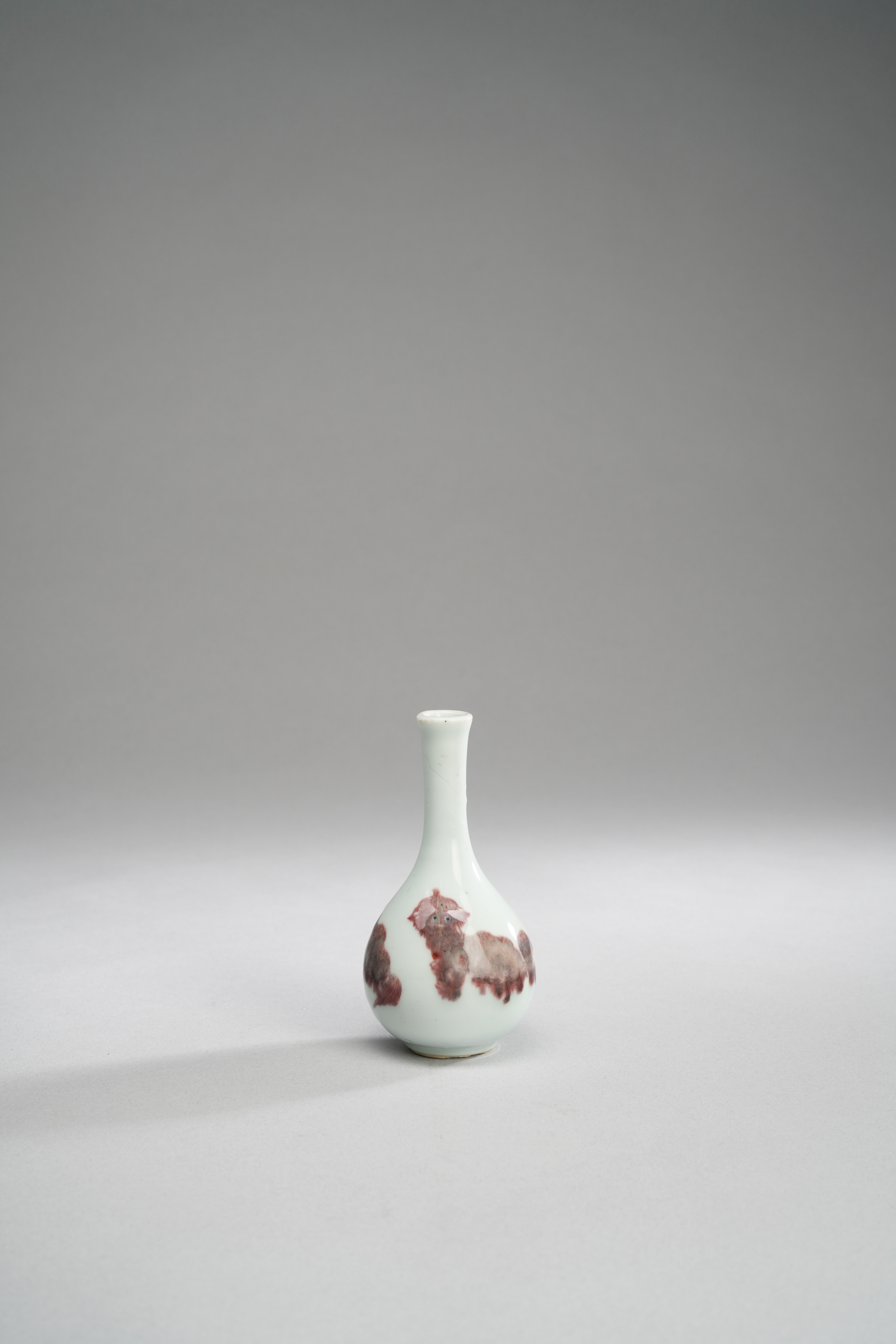 A SMALL CHINESE UNDERGLAZE RED 'BUDDHIST LIONS' BOTTLE VASE