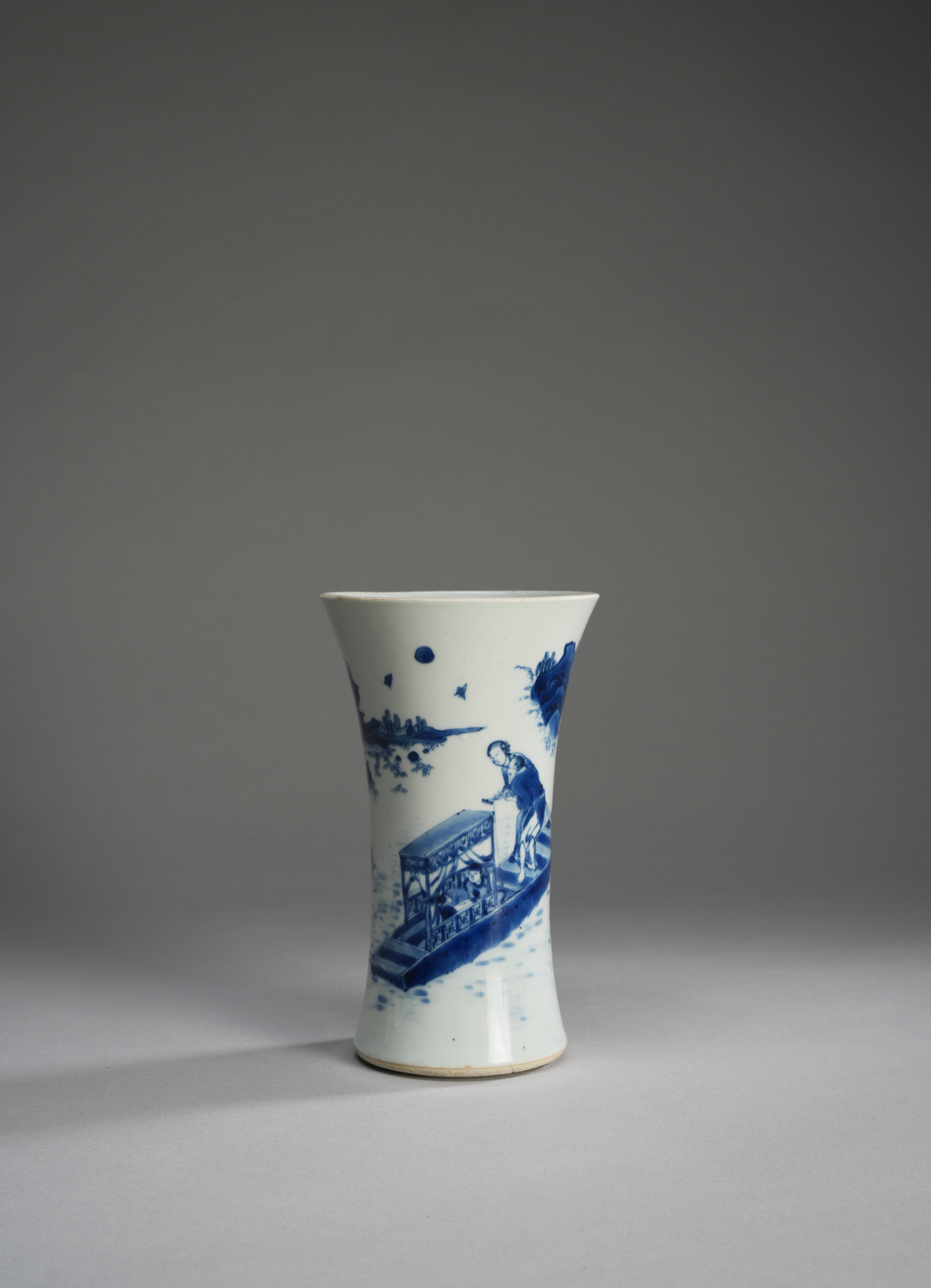 Cf. Christie's London, 15th May 2012, for a related Transitional Gu-shaped brushpot depicting figures in a sampan.