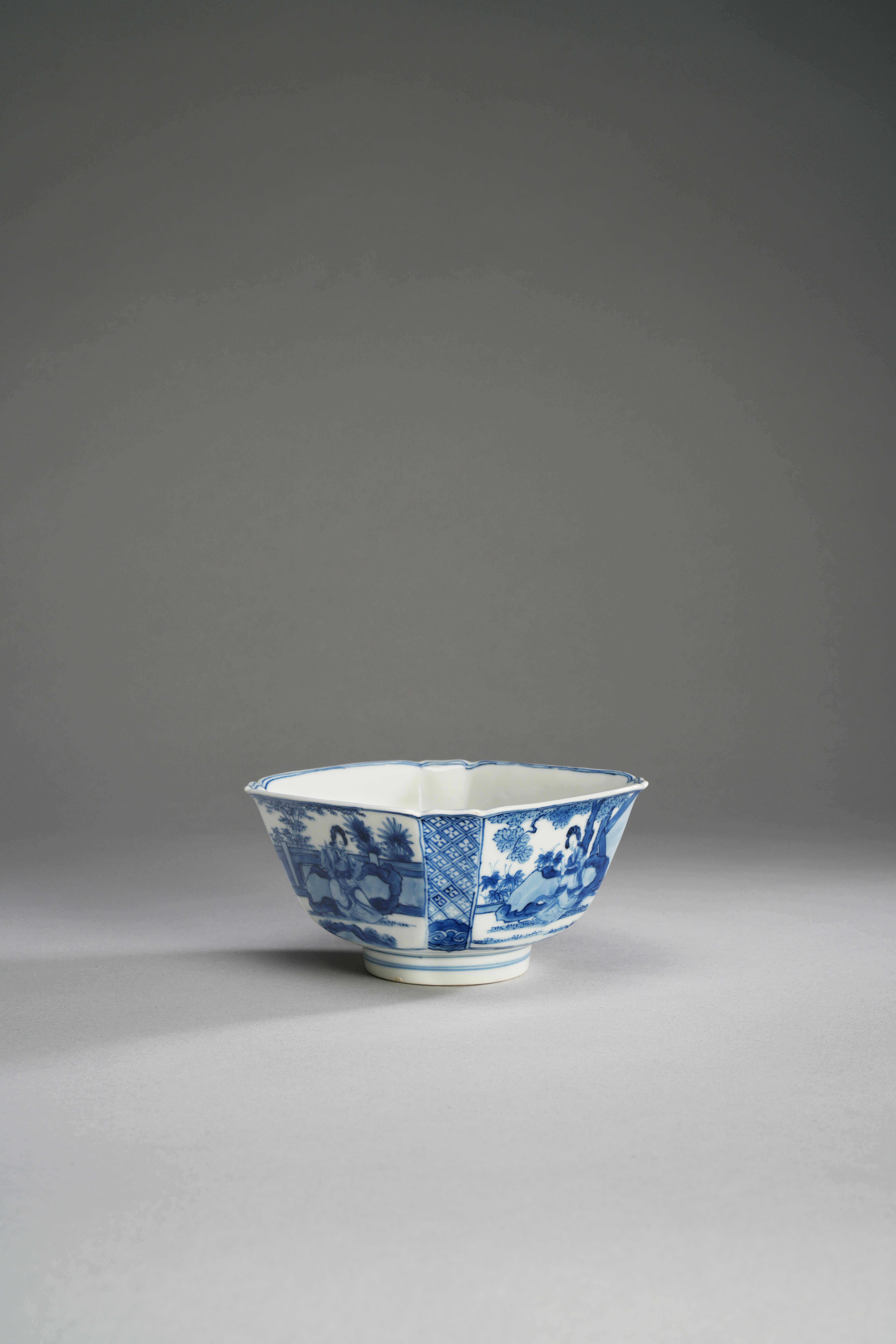 A CHINESE BLUE AND WHITE SQUARE 'LADIES AND BOYS' BOWL