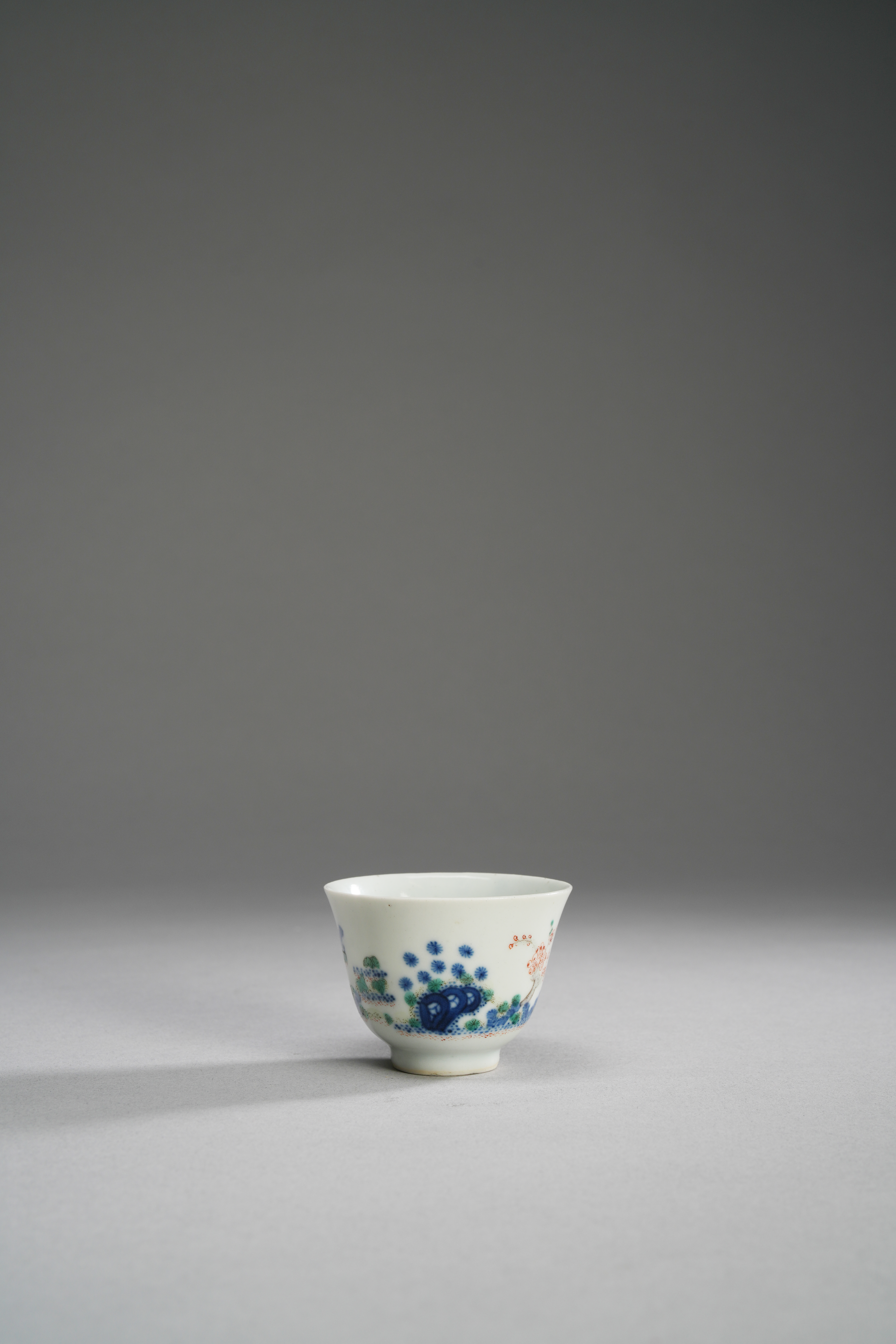 Painted in enamels and underglaze blue with a flowering crab apple tree amongst rocks and smaller plants representing the second month, the reverse with a poem which reads: