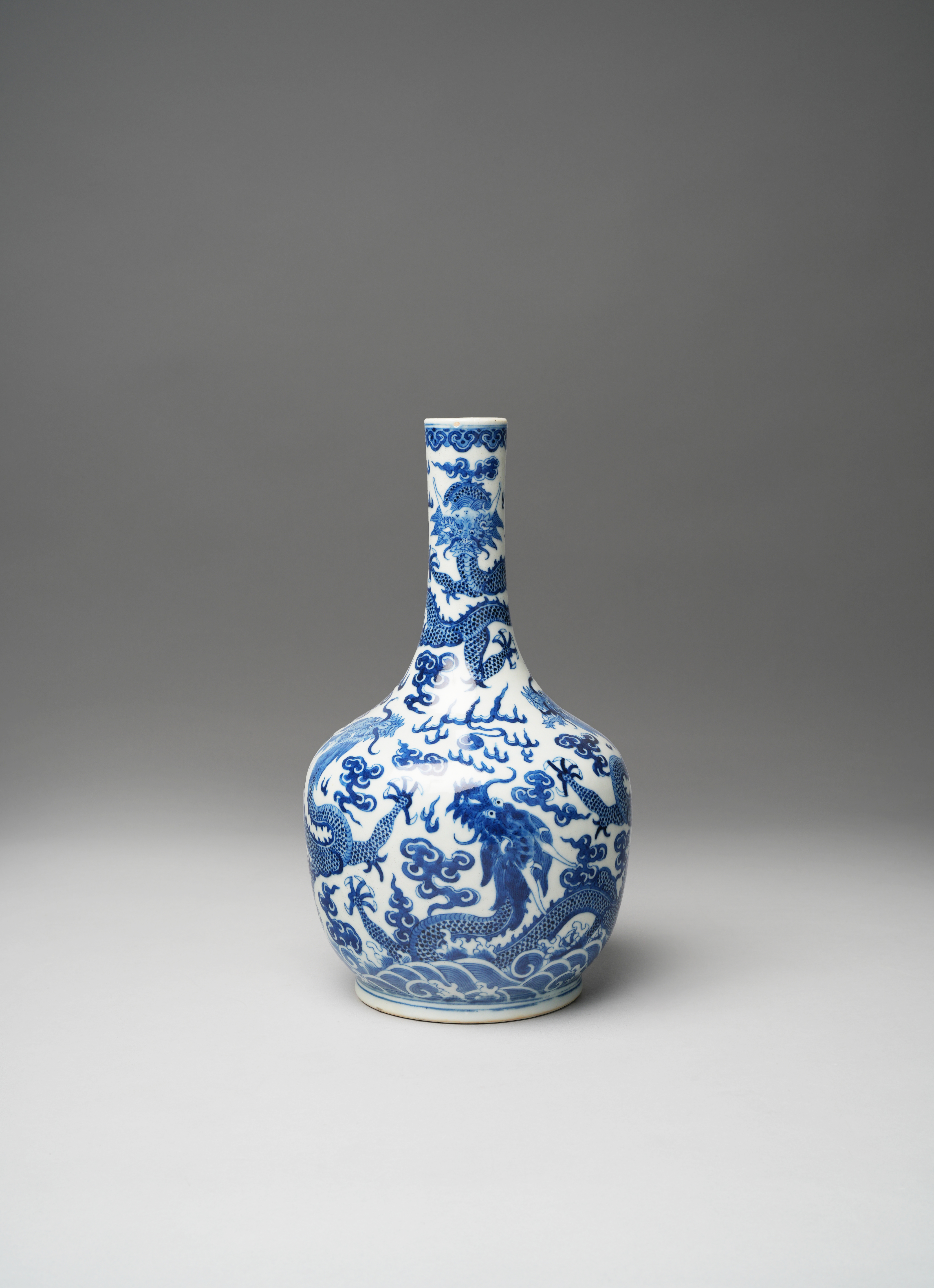 With an ovoid body and a tall slender neck, painted with three scaly five-clawed dragons chasing a sacred pearl of wisdom amongst clouds and flames above rolling waves, below a front-facing dragon to the neck, with a band of ruyi-heads to the rim, 31.5cm.