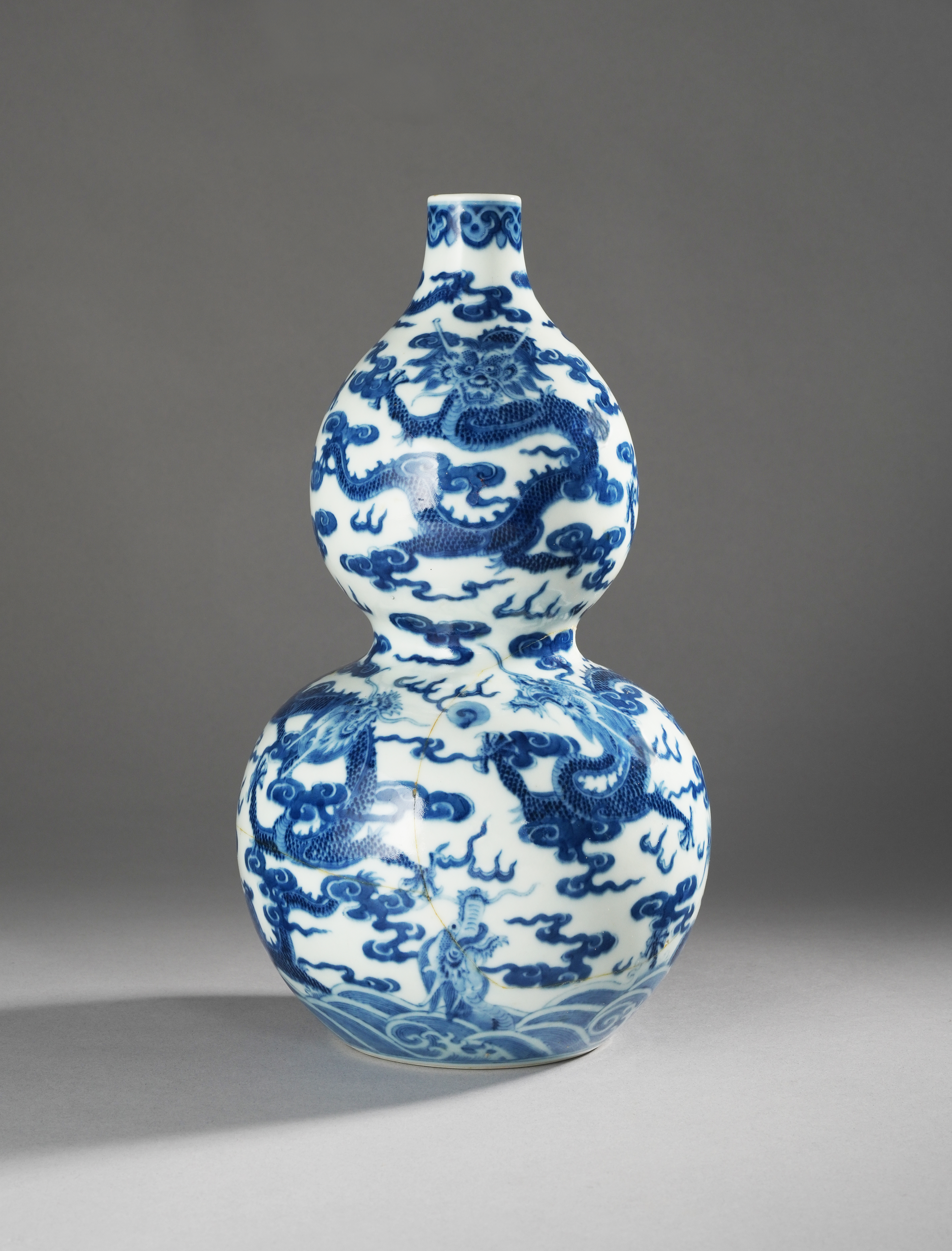 A RARE CHINESE BLUE AND WHITE DOUBLE-GOURD 'NINE DRAGON' VASE