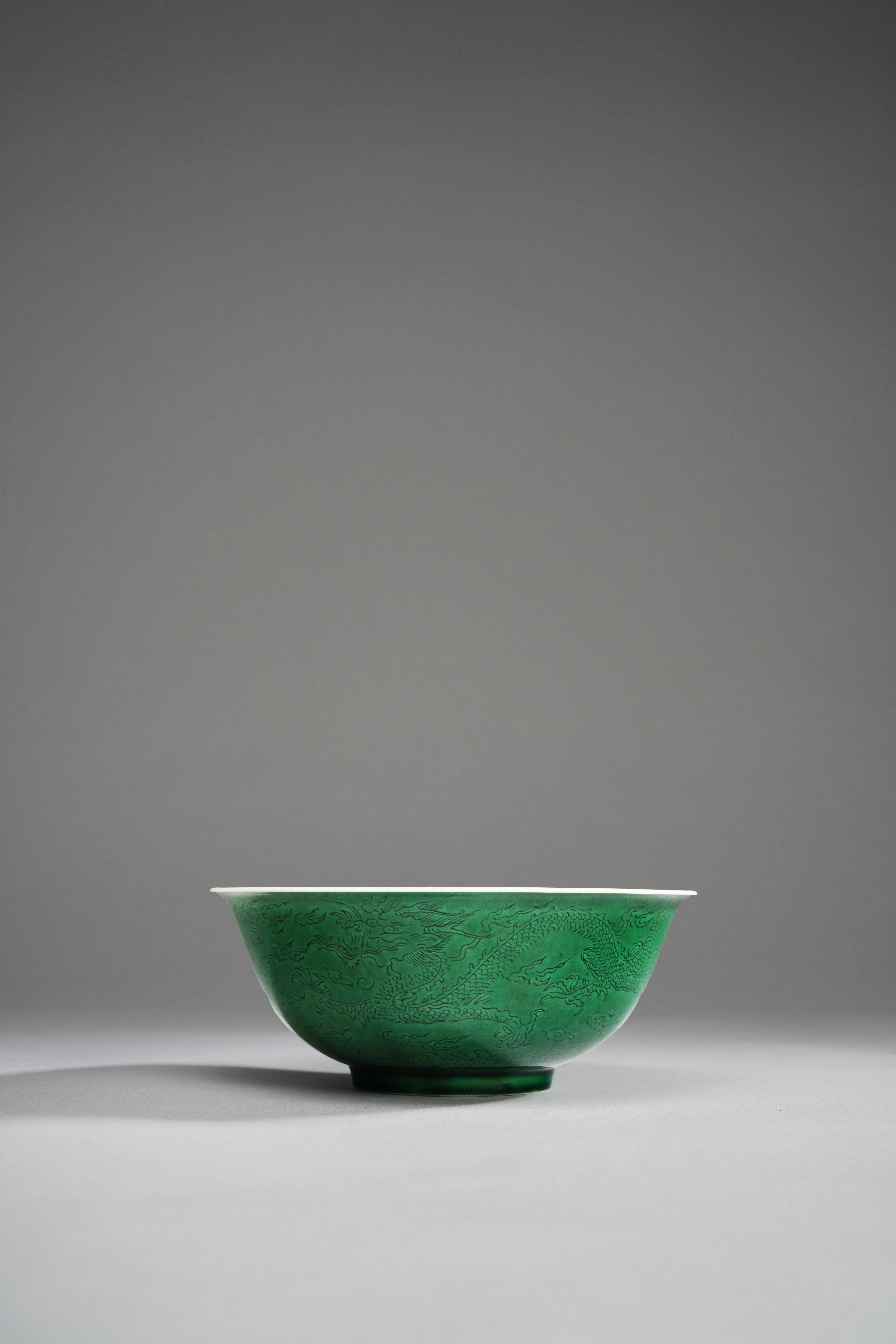 With deep rounded sides rising from a short foot to a flared rim, the exterior applied with a vibrant green glaze and incised with two scaly five-clawed dragons chasing flaming pearls above crashing waves, the interior painted with a medallion enclosing a further dragon chasing a pearl, with a double line border to the rim, 15.2cm.