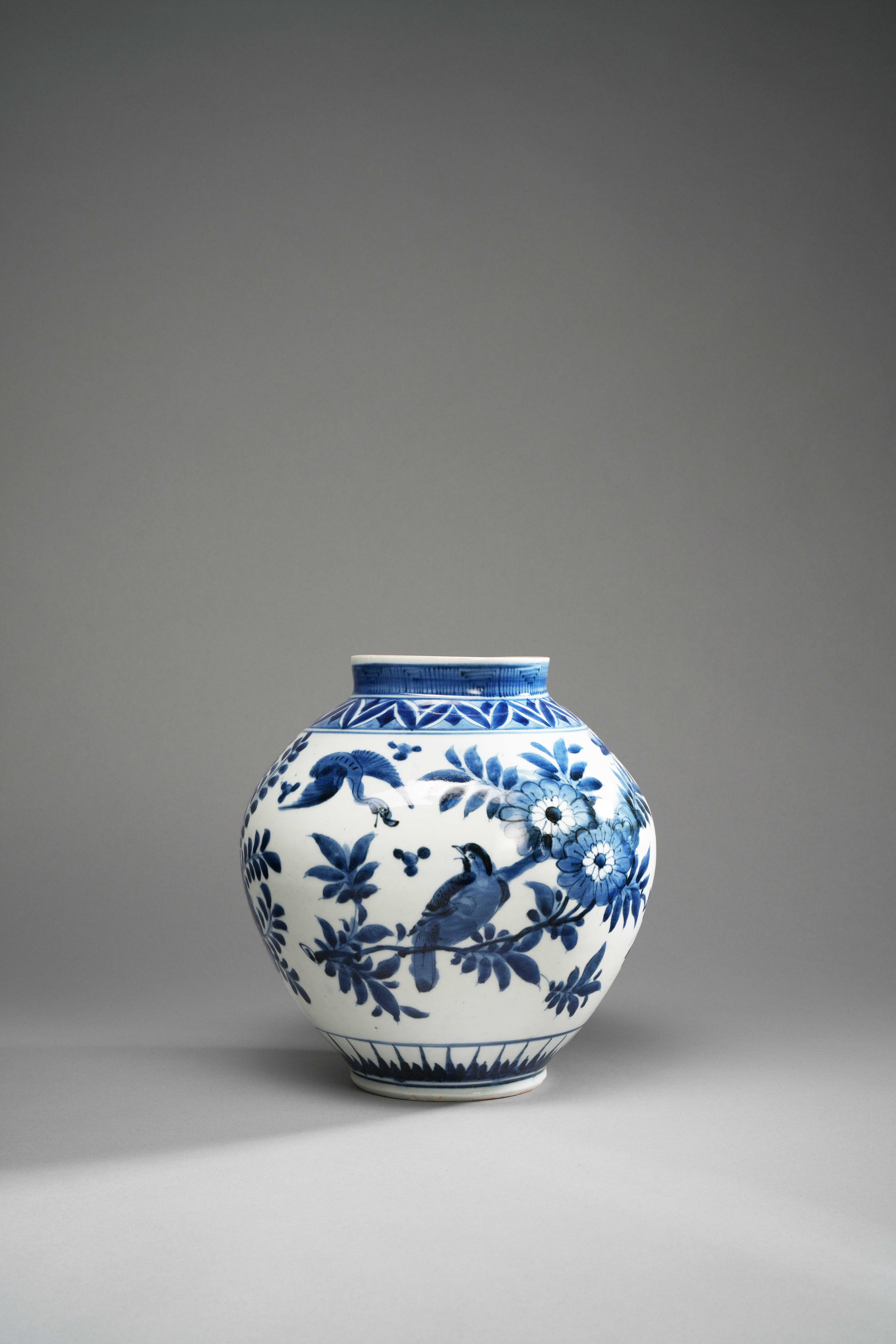 The ovoid body decorated with birds amongst flowering branches, with butterflies fluttering above, in between borders of lappets and key fret to the neck and above the foot, 23.5cm.