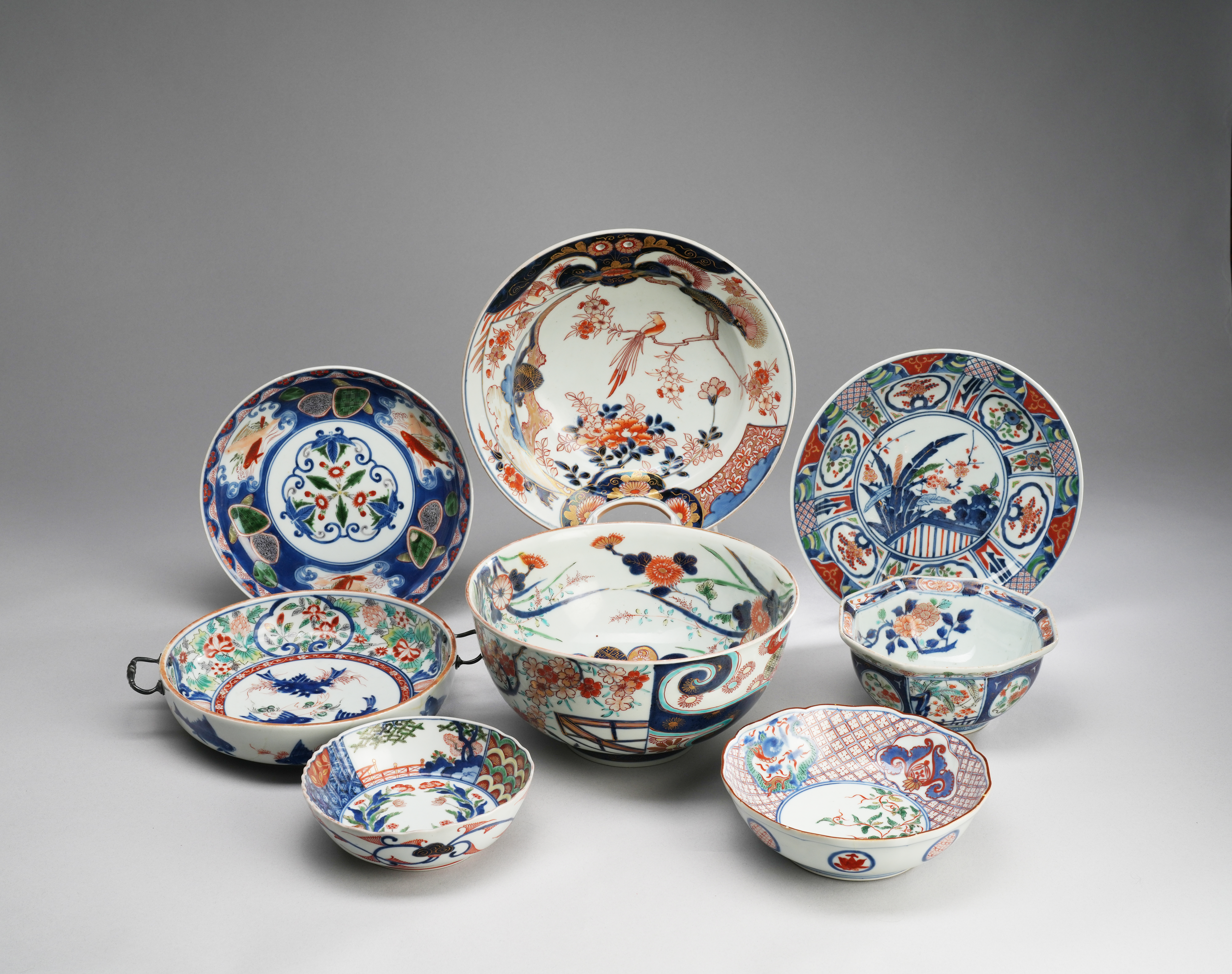 All variously decorated in underglaze blue, gilt and polychrome enamels, painted with birds, flowers, landscapes, brocade patterns and other formal designs, four with Chinese marks underneath; one a barber's bowl and another applied with metal handles, 27cm max. (8)