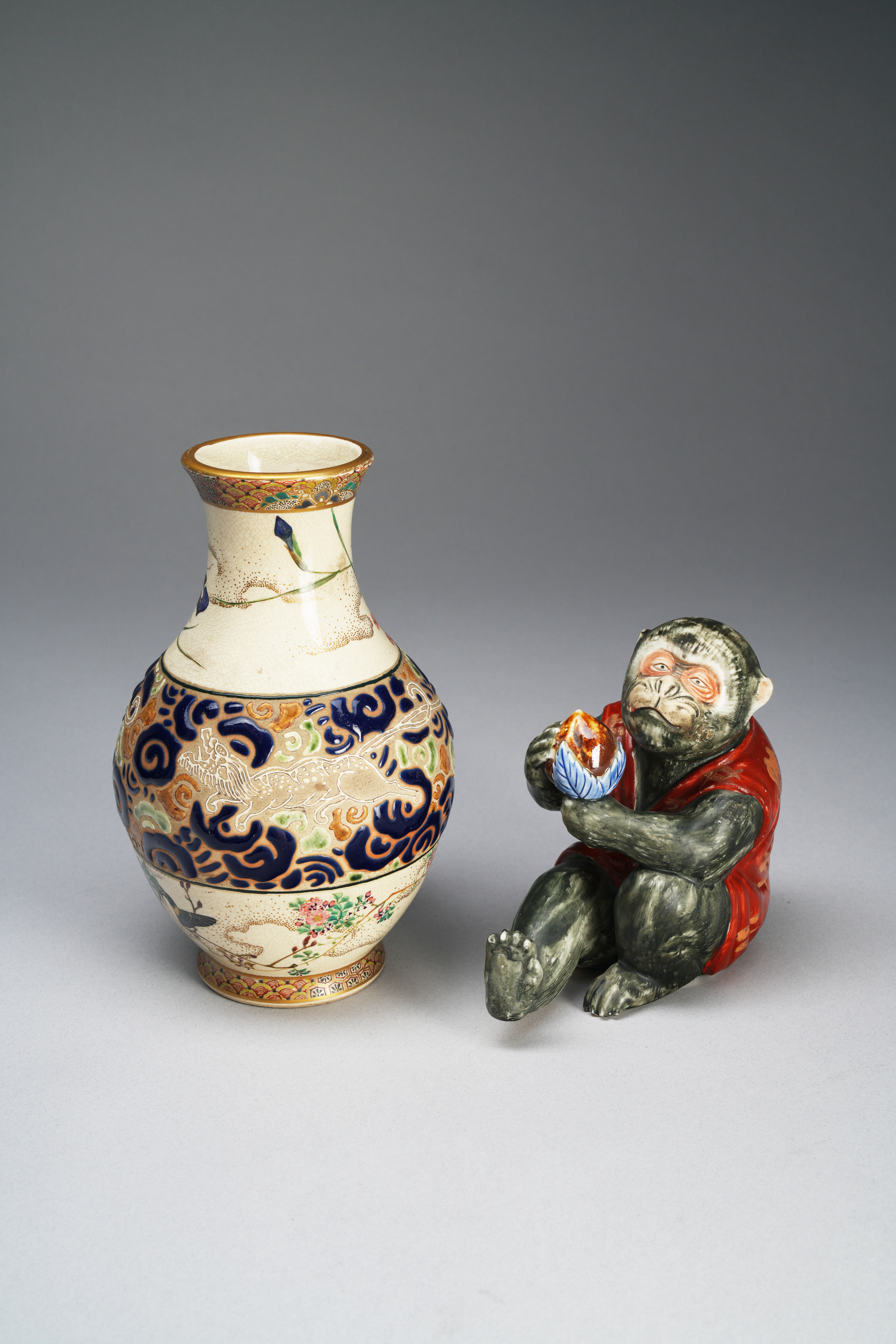 Decorated with shishi and waves in between borders of birds and flowers, insects and brocade patterns, the base signed Dai Nihon Taizan zo and impressed Taizan, 21cm; and a Hirado okimono of a monkey holding a peach, inscribed Hono, Kanbun ninen, Hirado, Imamura Kojiro (Dedicated by Imamura Kojiro, Kanbun 2nd year, 1662, Hirado), 15.5cm. (2)