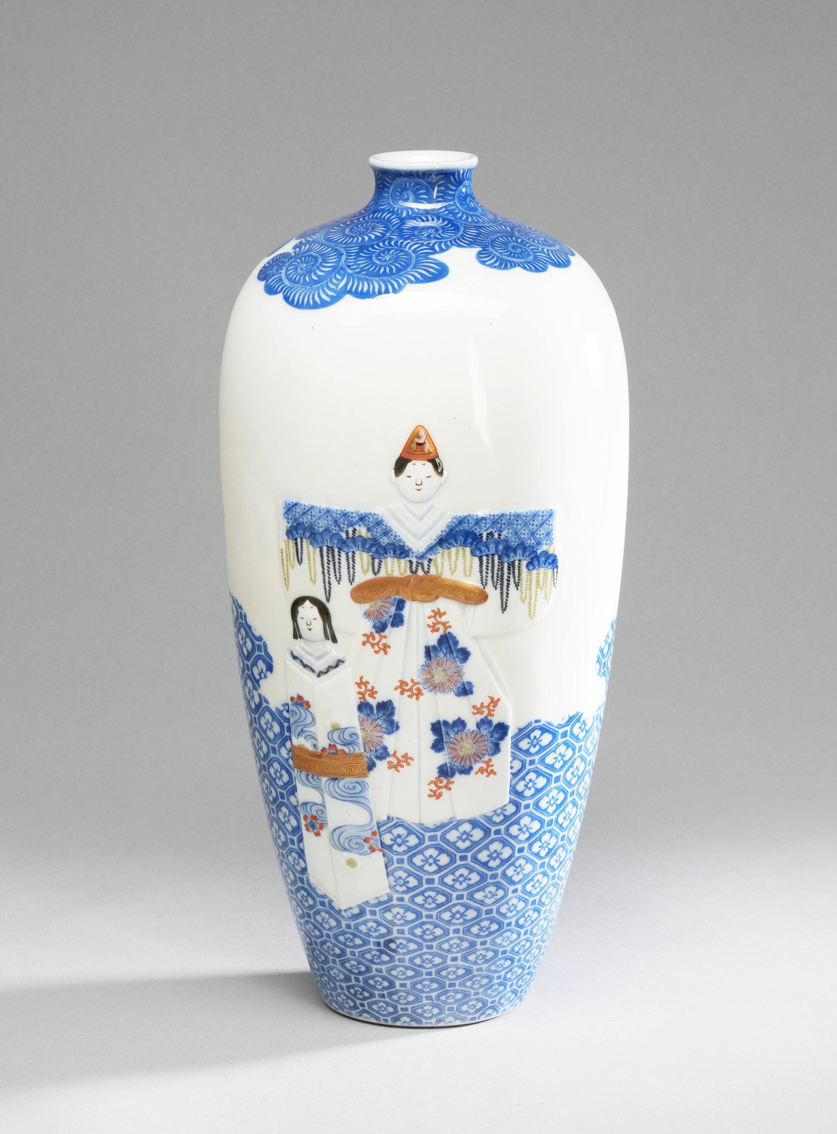 Decorated with a pair of tachibina (paper dolls for the Hinamatsuri or Girls' Day festival), with a band of kikkÅ-hanabishi pattern below and karakusa above; moulded in low relief and decorated in underglaze blue, gold lacquer and iron-red enamels, with a long mark underneath reading as Dai Nihon, Hizen (no) kuni, Arita, Fukagawa XX sei, 33.5cm.