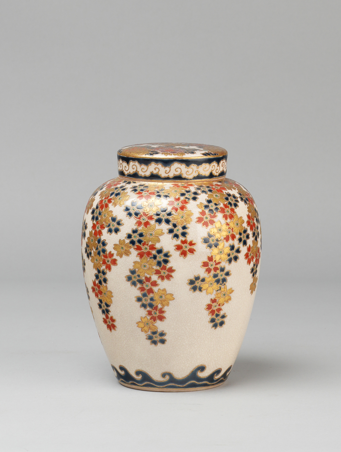 The ovoid body decorated with trailing cherry blossoms over stylised waves, the lid with peonies and scrolling clouds, the base signed Dai Nihon Satsuma, Hyokoseki-i, 16.5cm. (2)