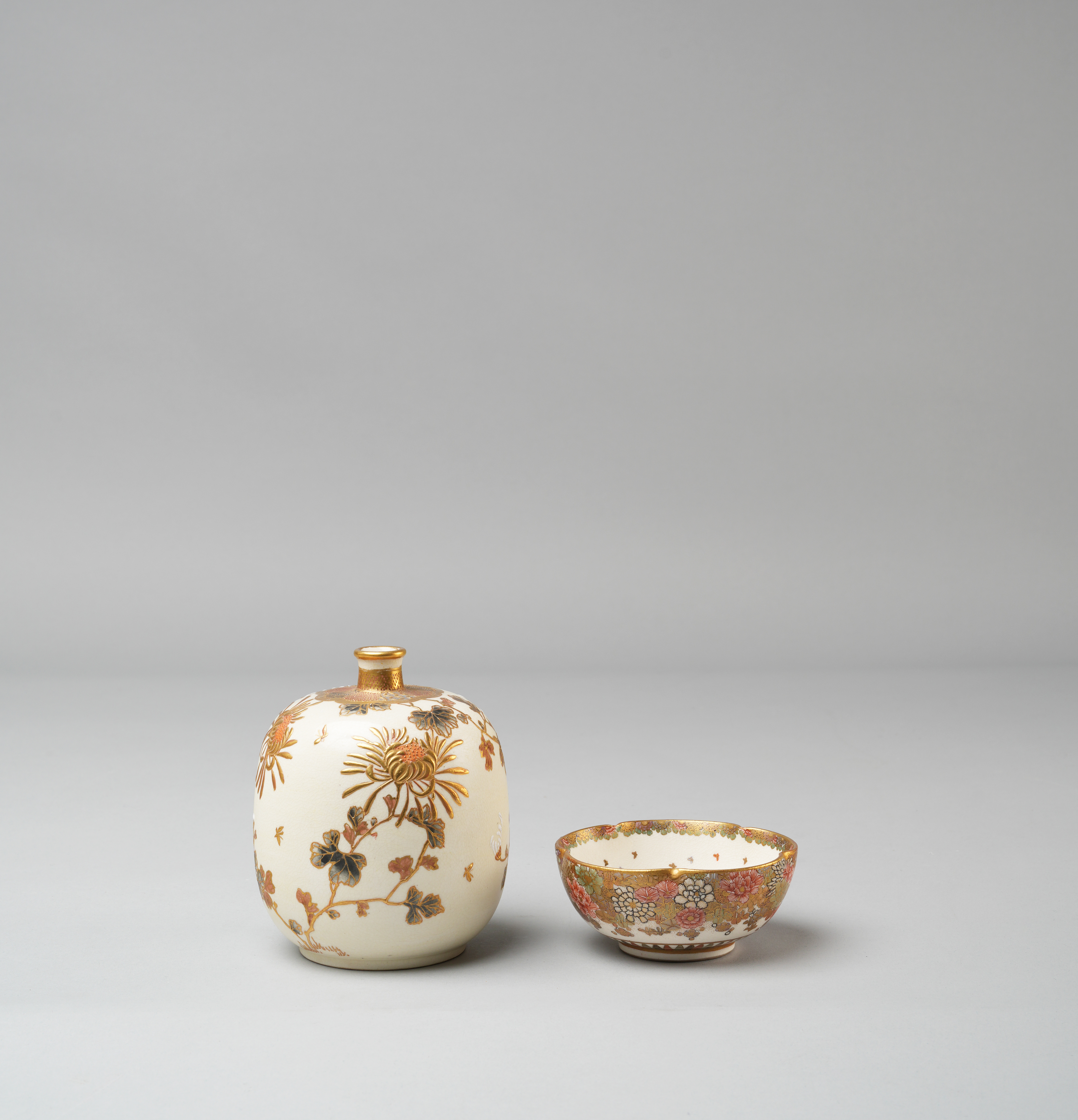 The first an ovoid vase with a short neck, decorated with flowering branches of chrysanthemum and panels of brocade patterns, the base inscribed Kinkozan sei, 11.5cm; together with a small foliate bowl delicately painted to the well with a kaleidoscope of butterflies, the exterior with flowerheads, the base inscribed Kinkozan in gilt and with an impressed Kinkozan sei mark, 9.2cm. (2)