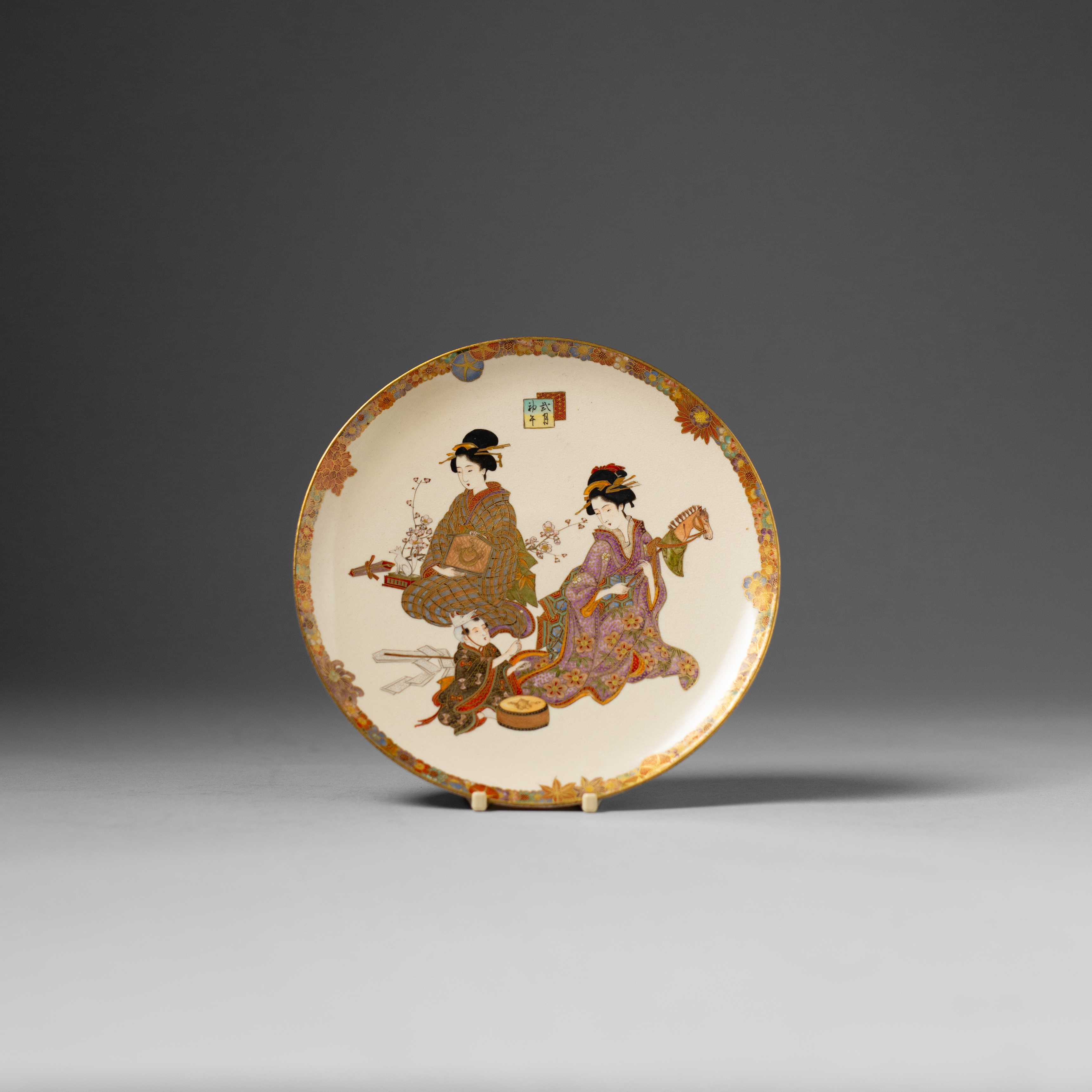 The well delicately painted with beauties and a child celebrating the Hatsuuma (First Horse Day), the boy playing the drum and with a fox mask on his head; signed Rei/Rai, 18.8cm.