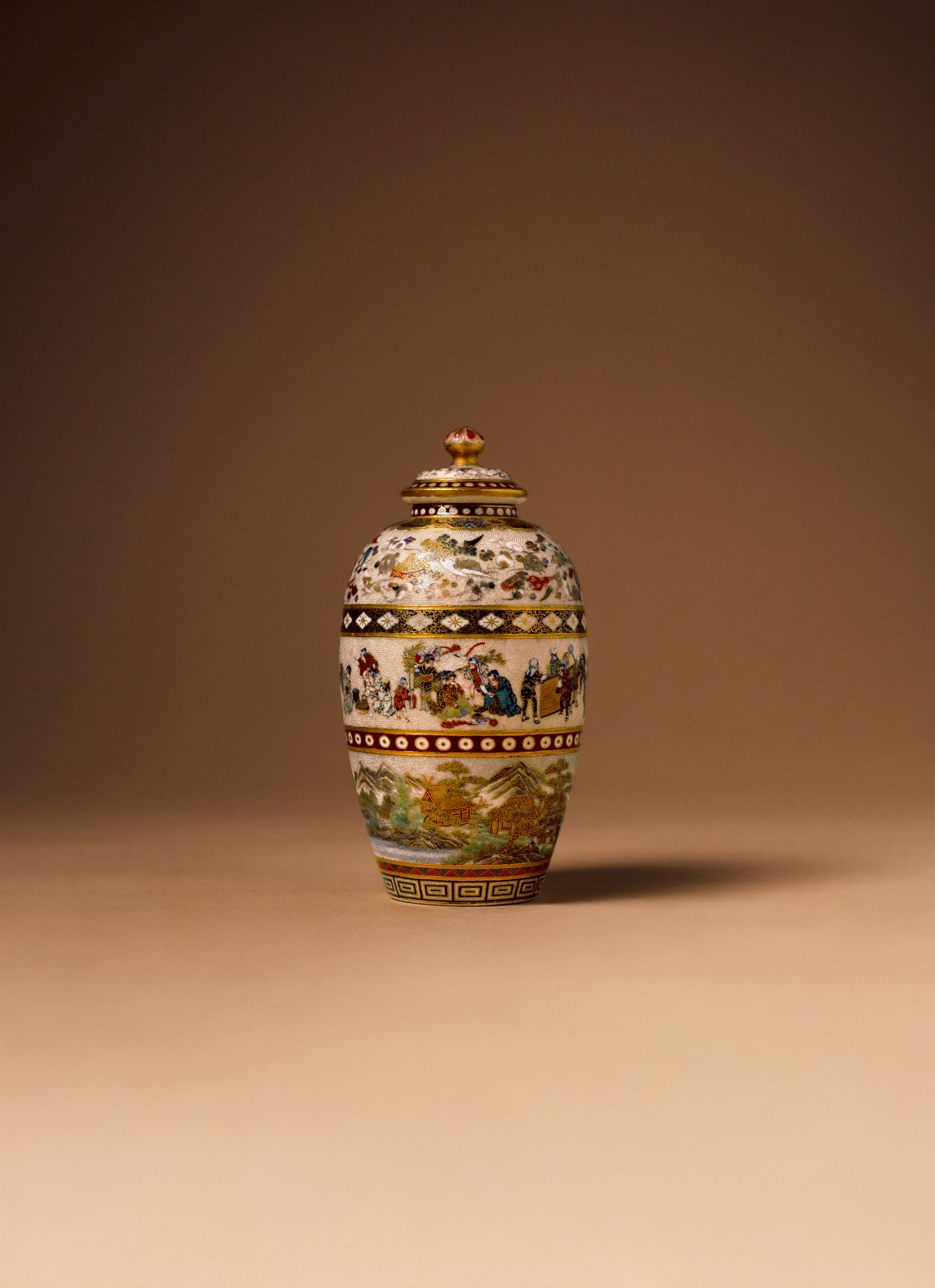 The ovoid body decorated with three continuous bands; the upper one with a large number of small mice causing mayhem amongst auspicious objects including Daikoku's mallet and tama (sacred jewels), the lid with similar decoration; the central band painted with many figures at leisure; the lower part with an expansive mountainous landscape, with figures crossing a lake on a boat and thatched pavilions to the side; all between borders of geometric patterns and other formal designs, the base signed Yabu Meizan in a double square, 12.5cm. (2)