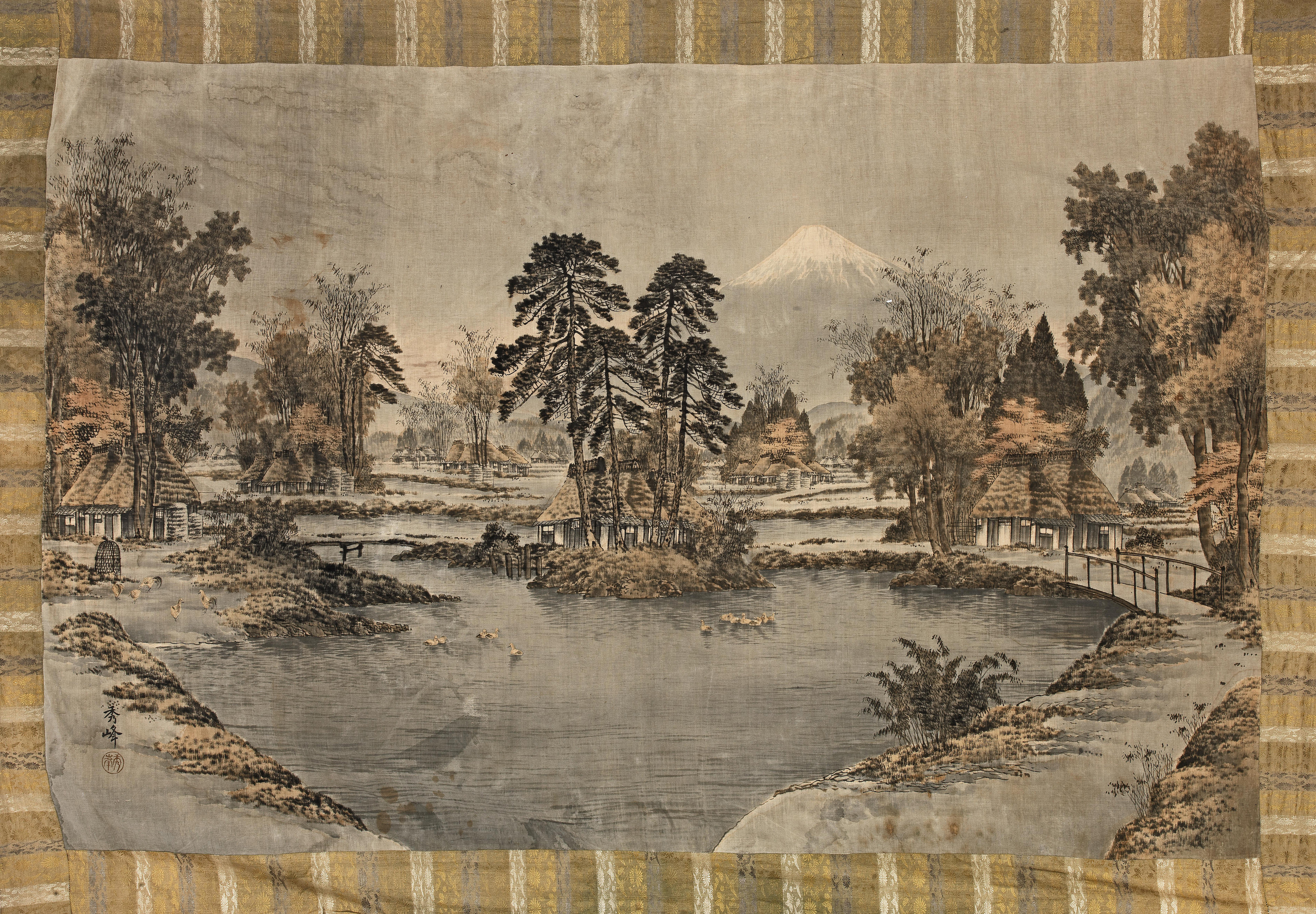 The large silk panel depicting a serene landscape with thatched pavilions by a lake, Mount Fuji towering in the distance; signed and sealed Shuho, 171cm x 262cm.