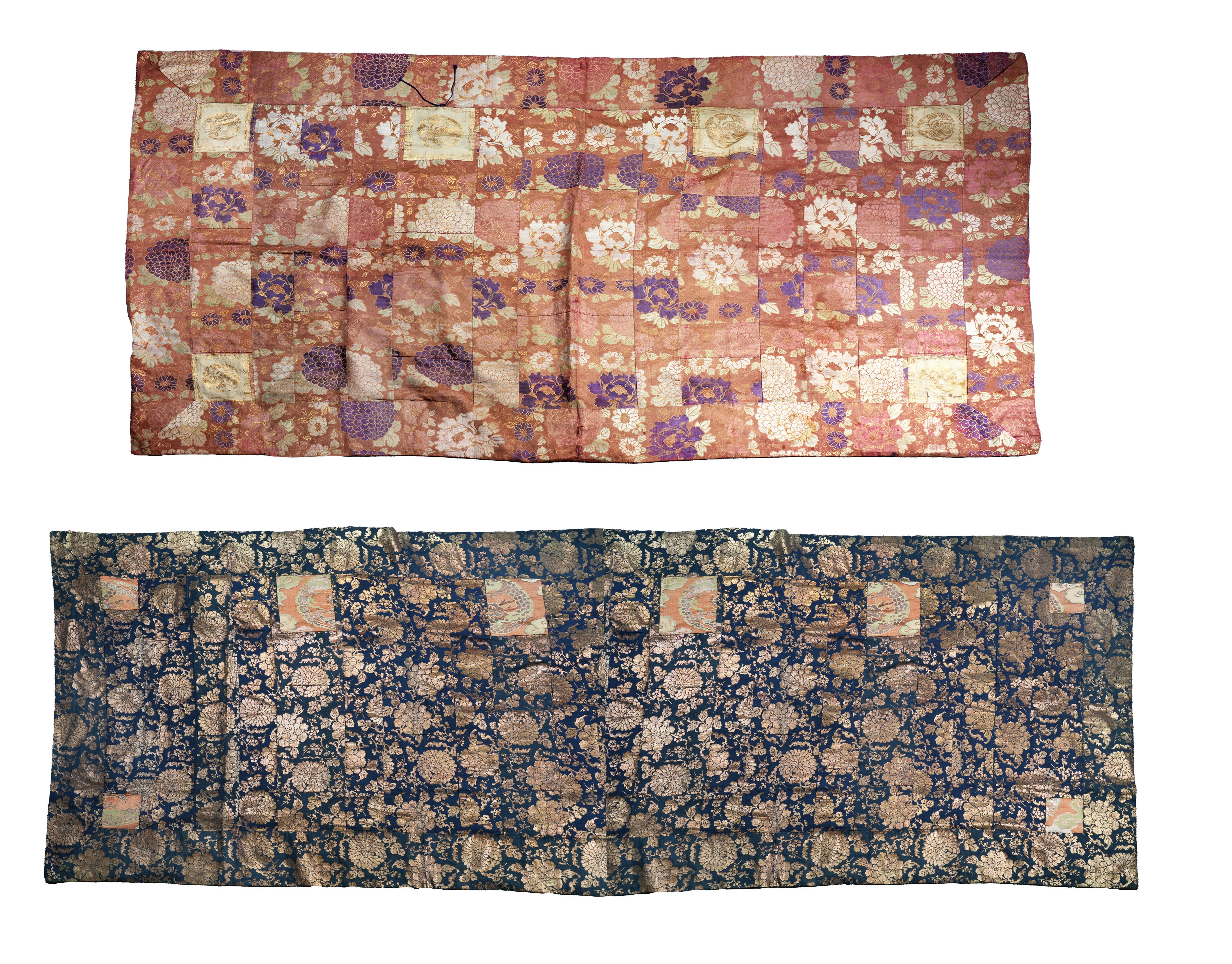 The Buddhist vestments typically made from textile fragments; one with gold chrysanthemum on a blue ground, with small orange square panels including part of a dragon amongst clouds; the other with colourful peonies on an orange ground, with squares enclosing floral roundels, 108cm x 201cm and 113cm x 204cm respectively. (2)