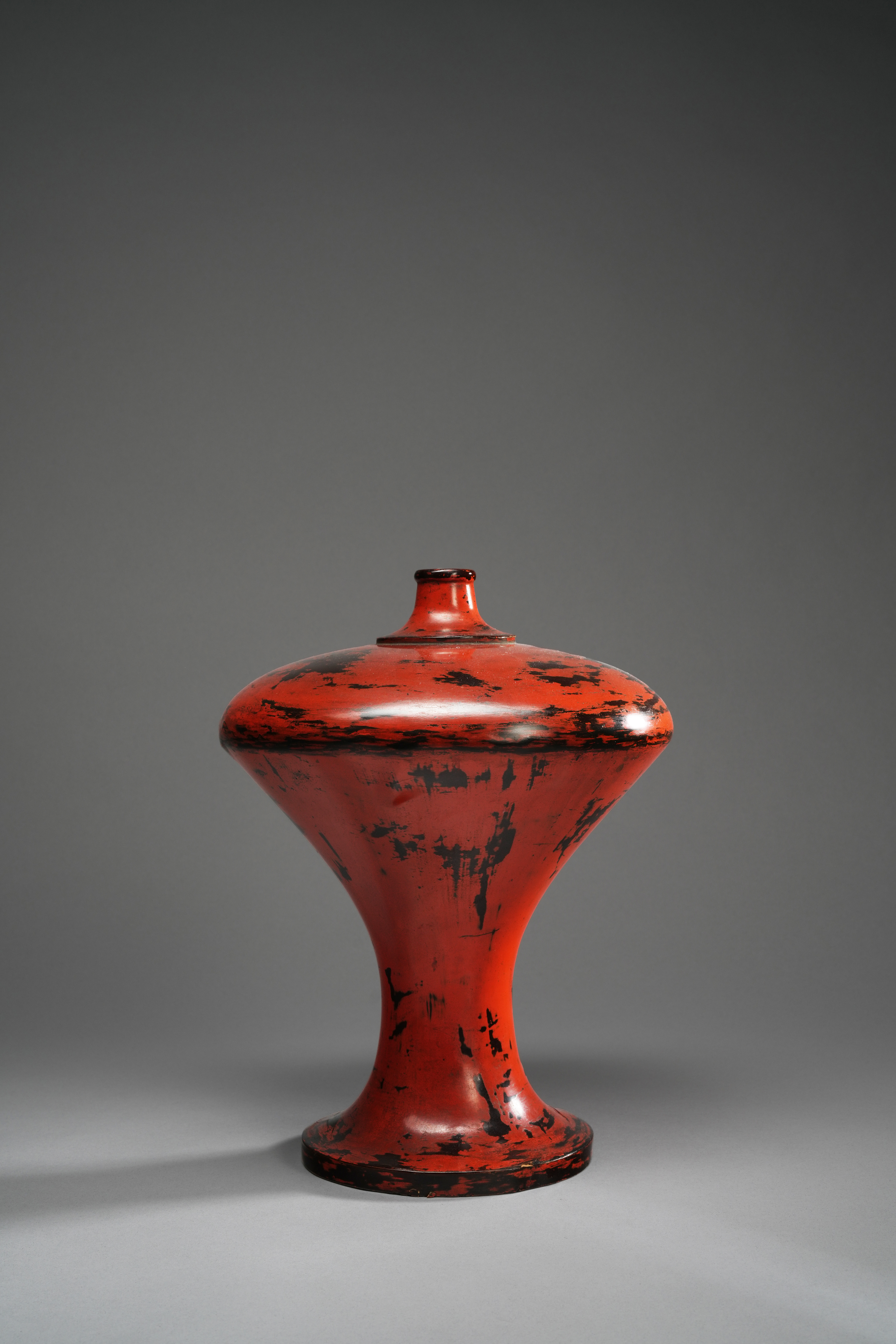 Of typical form, with a tapered neck, a broad shoulder raised on a narrow foot and a wide base, painted in warm coral-red lacquer on a black ground, 33cm.