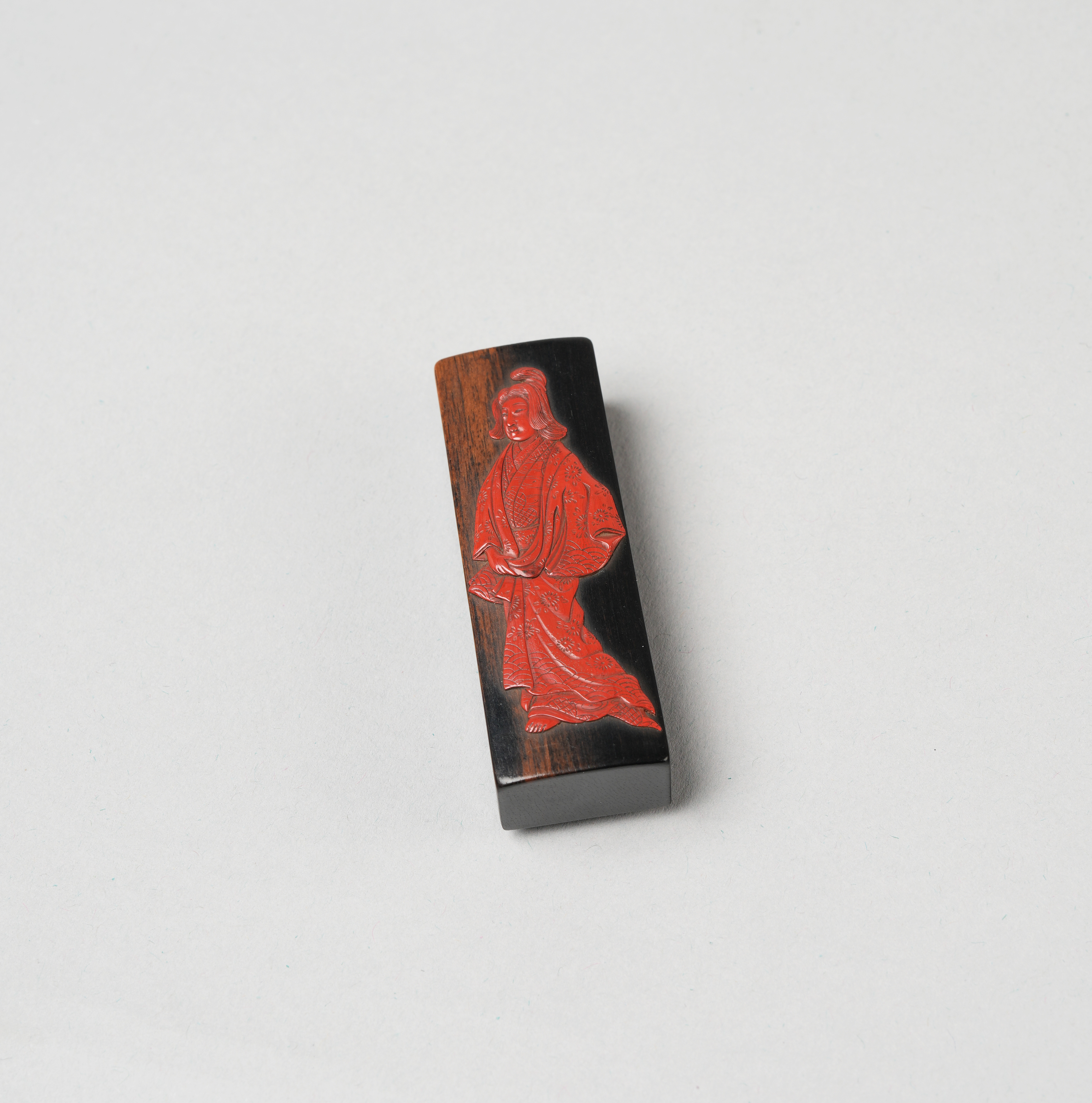Of long rectangular shape, the lid decorated with a beauty depicted in tsuishu red lacquer, the base possibly signed Kiichi and the himotoshi lined with a ring stained green, 1.7cm x 1.9cm x 5.8cm. (2)
