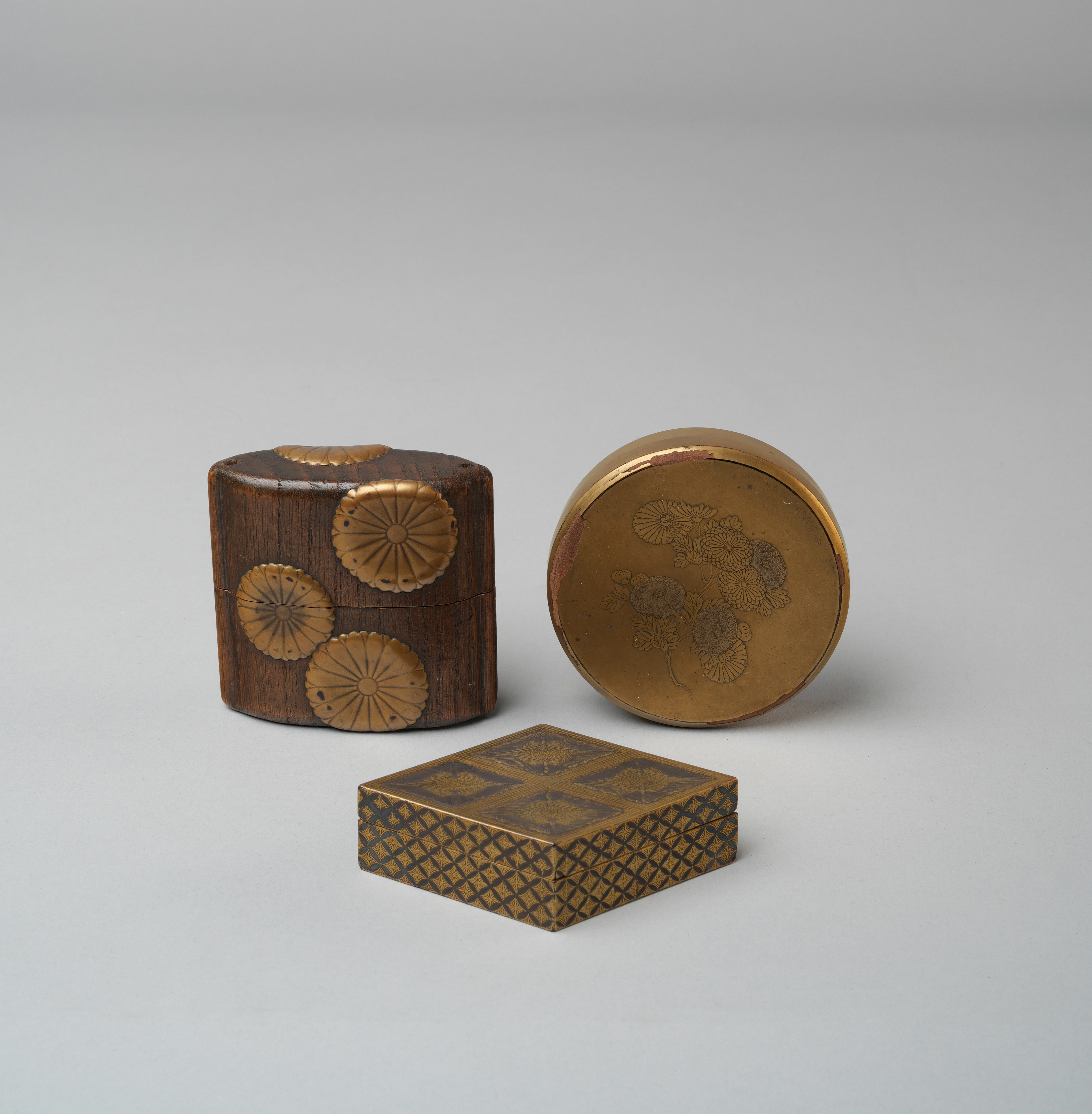 Including a single-case inro decorated with chrysanthemum mon in gold takamaki-e, the base signed Yoyusai; together with two kÅbako (incense boxes), one circular with chrysanthemum sprays and the other of rhomboid form with butterflies, 10.3cm max. (6)
