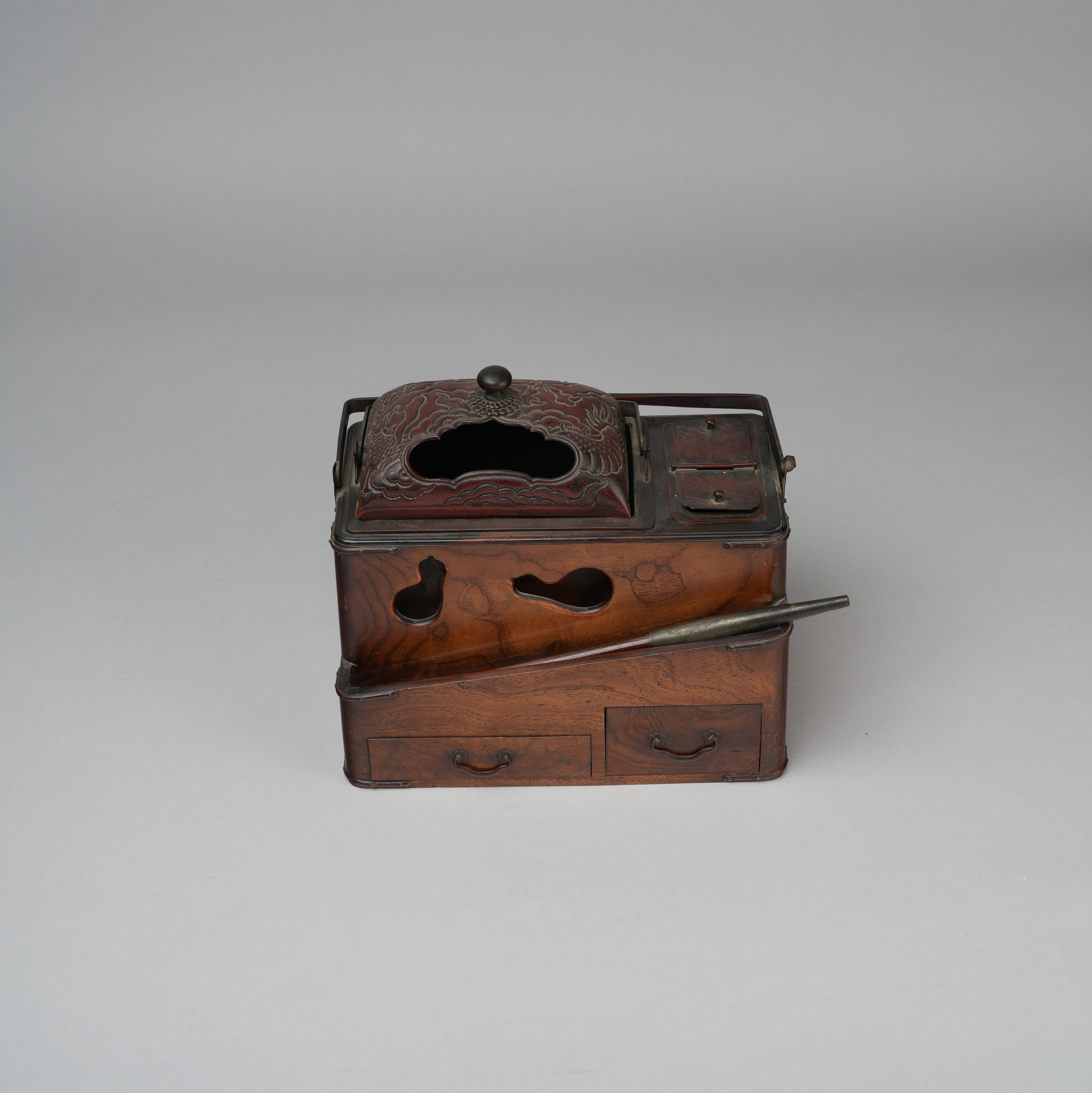 Of rectangular form with drawers, the cover decorated with a large writhing dragon and with gourd-shaped apertures; together with a long smocking pipe, 18cm x 20.5cm x 13cm. (7)