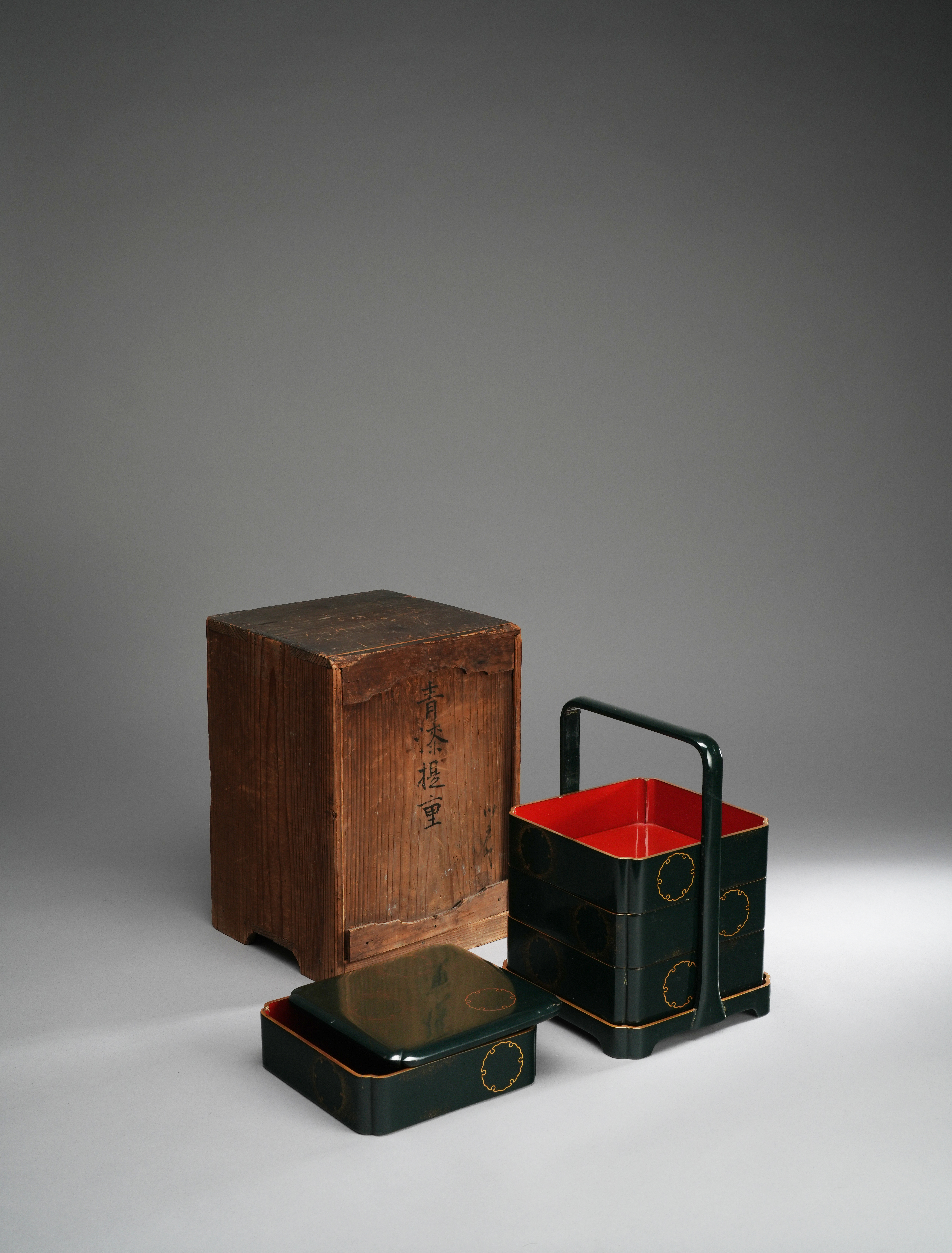 Made up of four tiers and a lid, raised on a stand with a loop handle; painted with snowflakes in gold lacquer on the dark emerald-green ground, the interior in cinnabar red, 26cm overall; with a fitted tomobako (wood box) inscribed 'Collection of the Kurata Family'. (7)