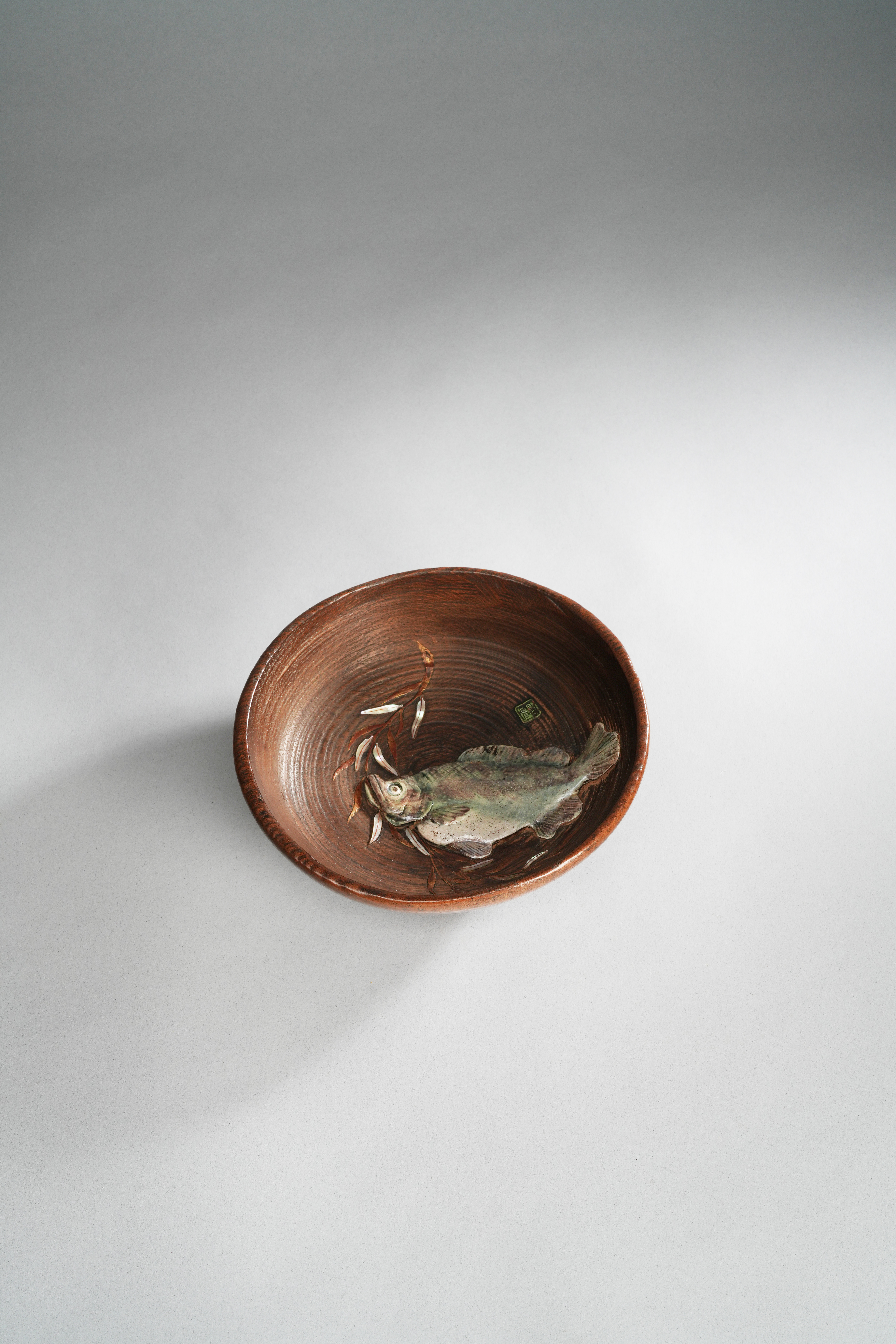 The turned bowl decorated with a large sea bass to the well, the fish realistically rendered in porcelain, with a willow branch beside it in gold lacquer and mother of pearl; a green porcelain Kan seal mark above, 19.6cm; together with a tomobako (wood box). (2)