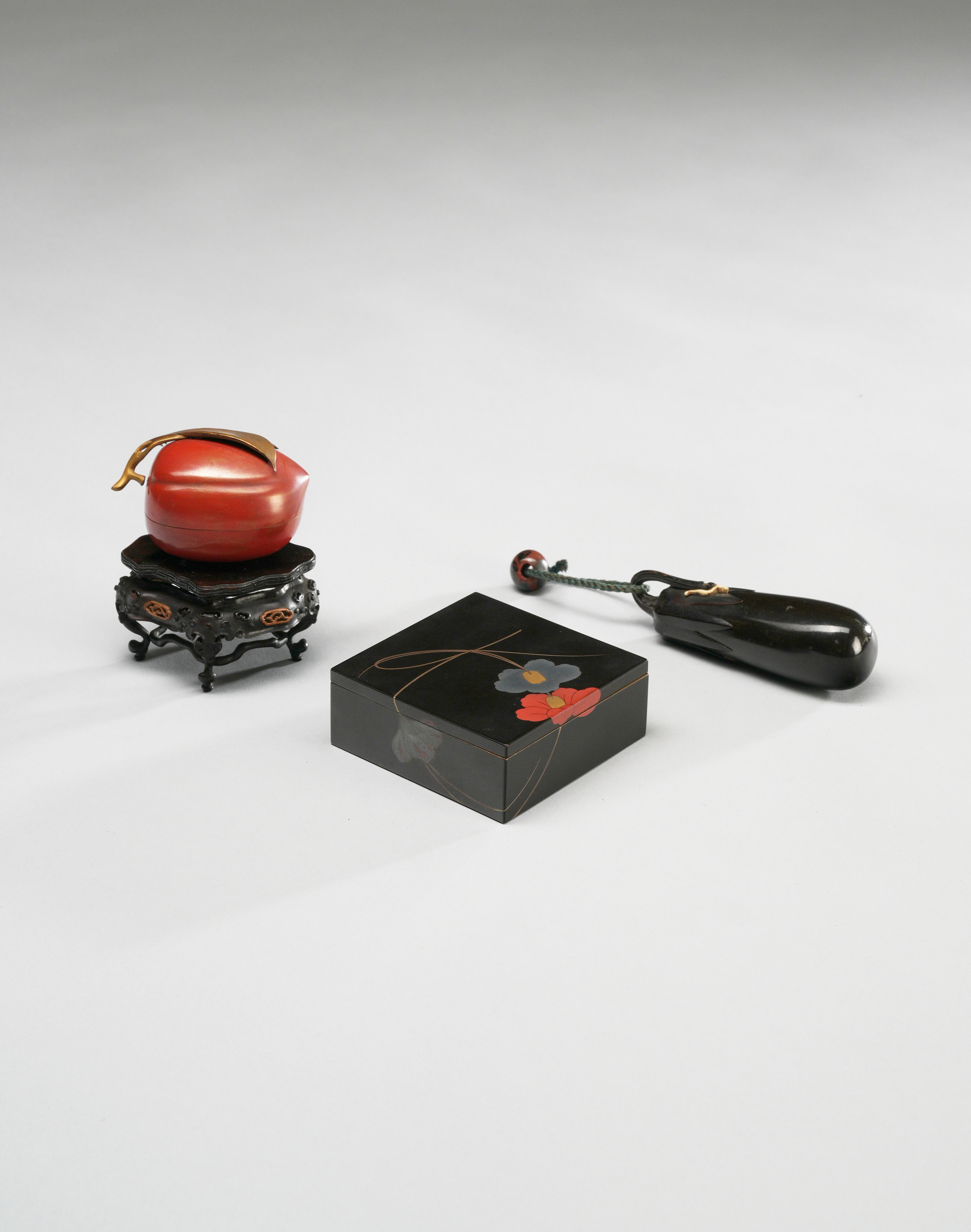 The first a square box and cover, decorated with camellia flowers strung on a thin ribbon, rendered in red, gold and silver fundame on the black roiro lacquer ground, the inside in silver togidashi with specks of gold, with a paper collection label for 'Tomkinson Collection 204', and another label inside inscribed 2154/2; another box and cover naturalistically modelled as a persimmon with a leafy stem, in red and gold hiramaki-e and with a nashiji interior and base, with a paper collection label for 'Tomkinson Collection' and possibly '694', raised on an associated Chinese stand with Tomkinson Collection label possibly inscribed 'I, 324a' ; together with an unusual aubergine-shaped wood tonkotsu (tobacco box) with a glass ojime; 8cm max. (7)