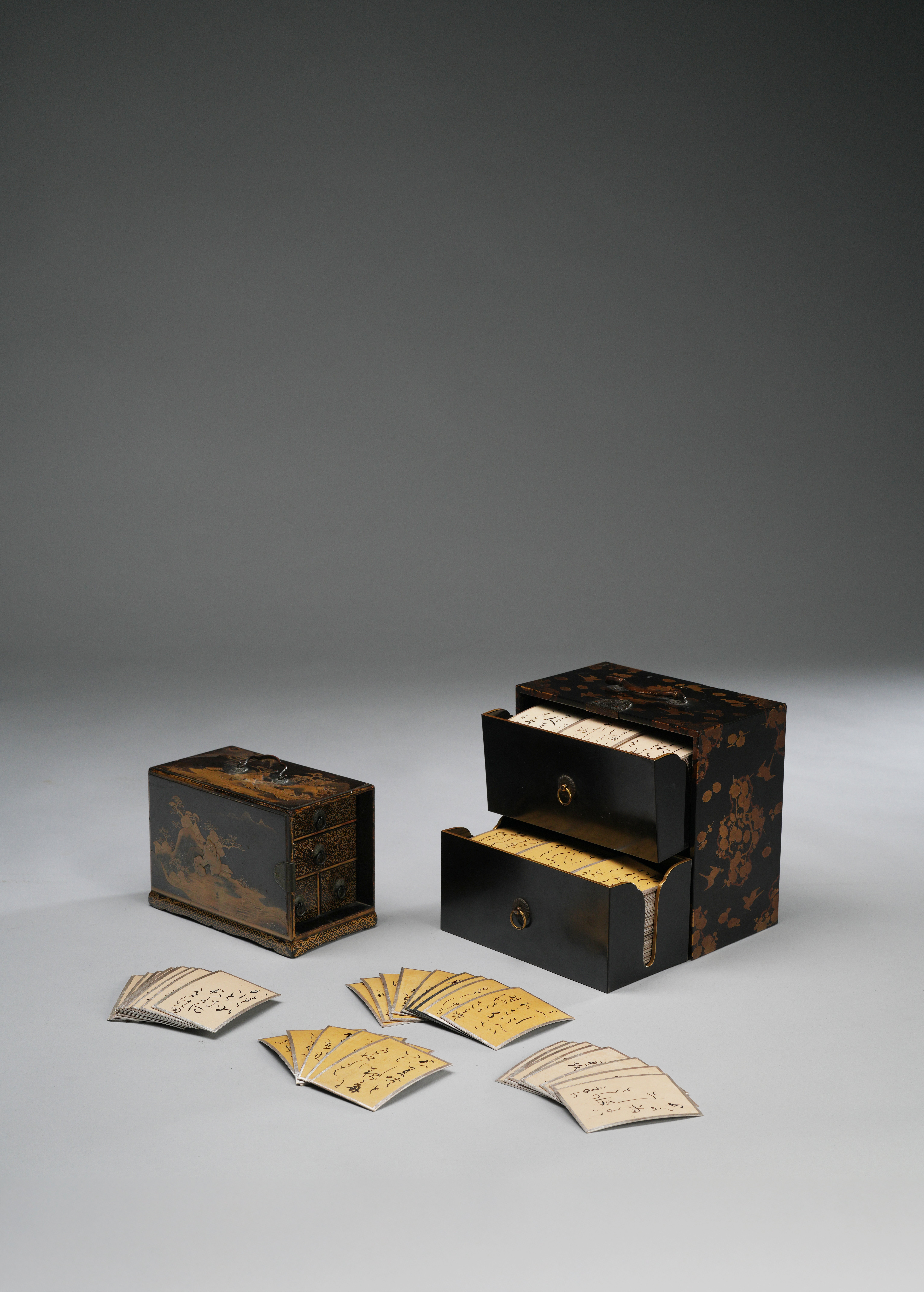 One of long rectangular form with four small drawers to the side, decorated in gold hiramaki-e, fundame and kirikane on a black roiro ground with pavilions in mountainous river landscapes, the top with a waterfall; the taller cabinet with two front drawers, decorated to the sides and back with many birds flying amongst flowering prunus branches, rendered in gold hiramaki-e and nashiji on a roiro ground; the drawers containing a set of four hundred and two uta garuta (poem cards) for the Hyakunin Isshu game, each hand-written in sumi ink and with a silver leaf backing; 18cm x17.3cm x 10.2cm max. (410)