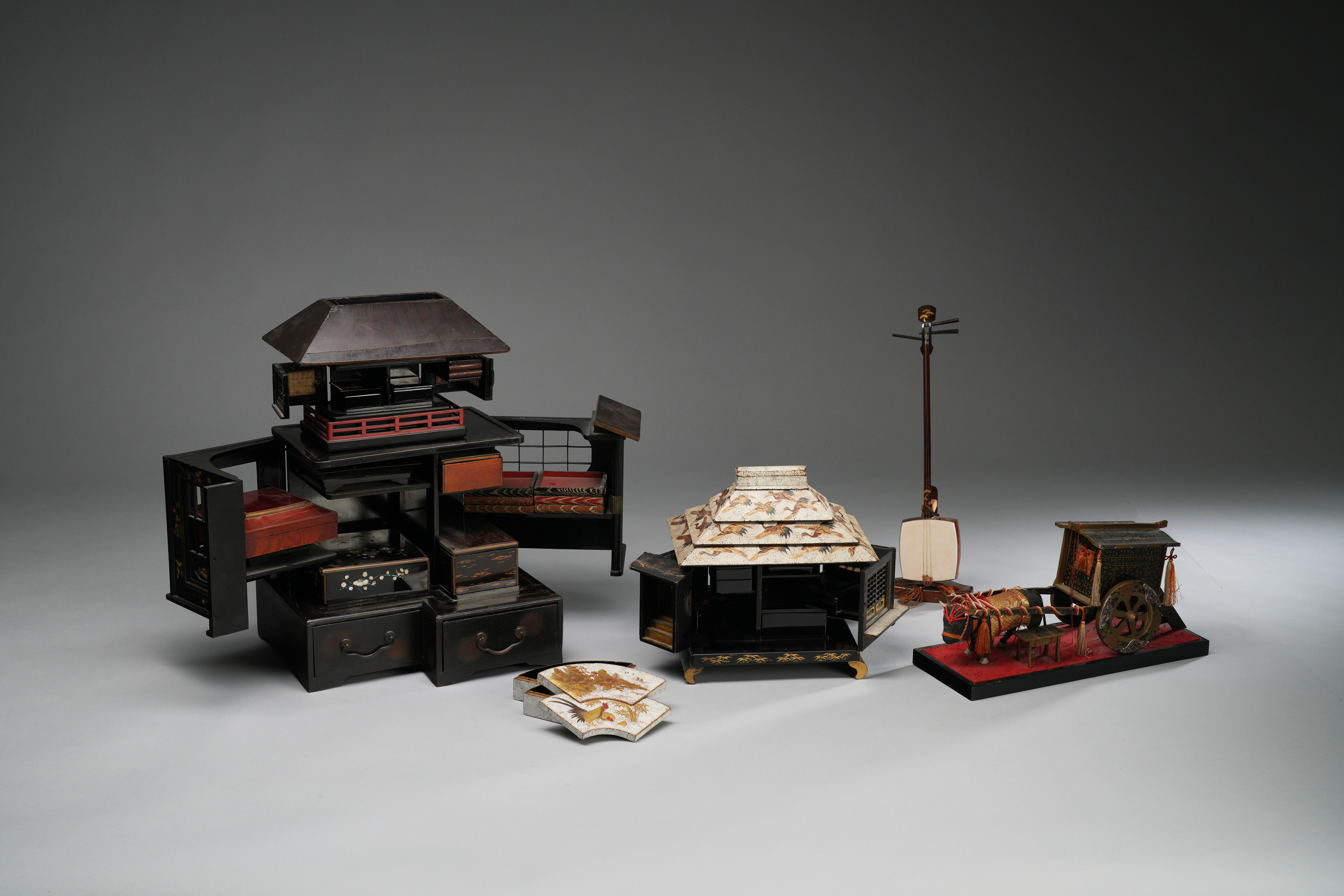 Comprised of two models of multi-storey pavilions, each opening to reveal many compartments, trays and boxes, one with details rendered in eggshell; a fan-shaped box and cover, the surface also decorated in white eggshells, gold and iroe hiramaki-e lacquer, with chickens and a landscape; together with a model of an ox-drawn cart and a miniature shamisen, 40cm max. (49)