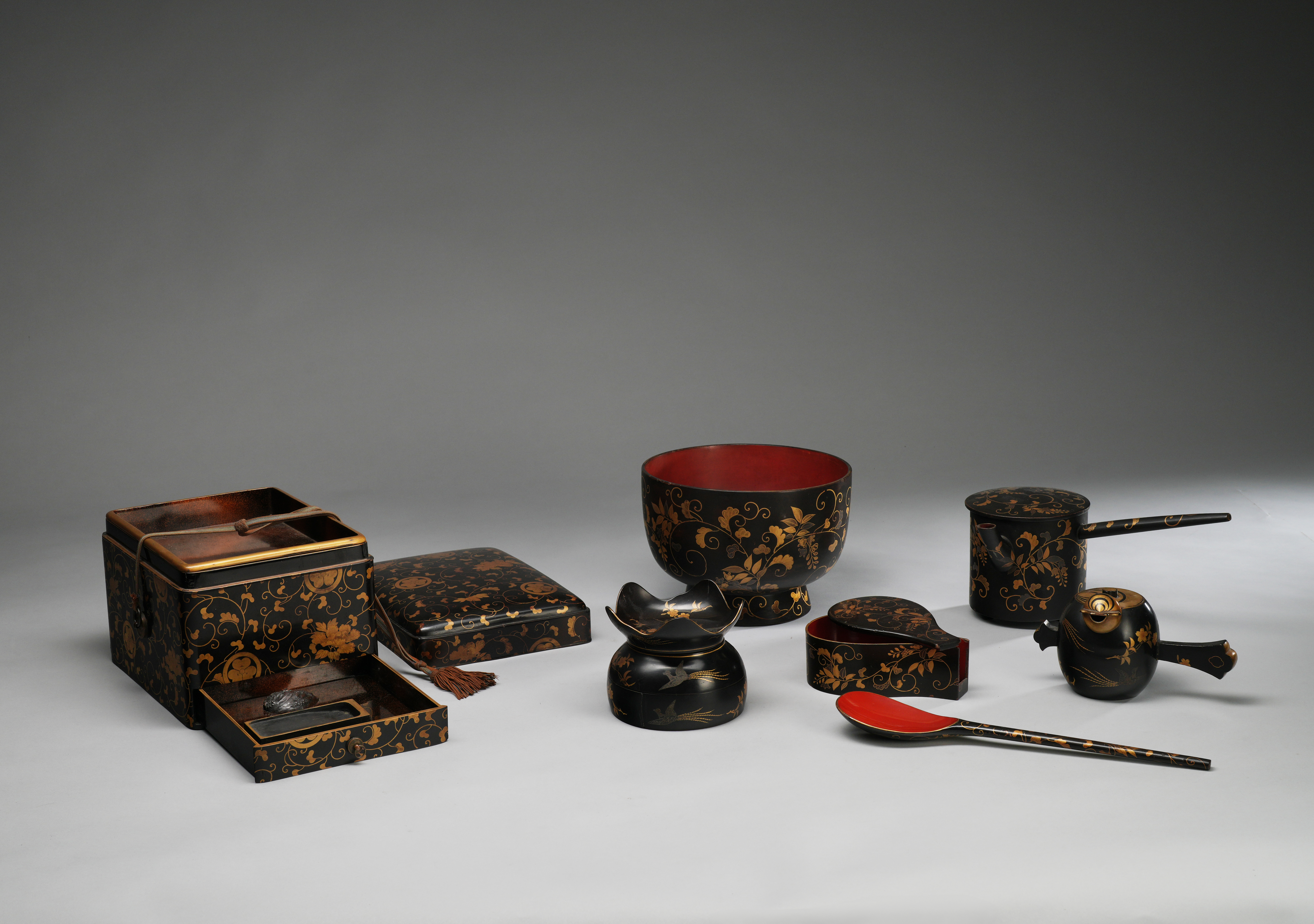 Decorated in gold and silver hiramaki-e on a black roiro ground, some with areas in red lacquer; most decorated with scrolling leafy tendrils; one a combined bunko and suzuribako, the tall rectangular box with an inner tray and a drawer opening to reveal an ink stone and a shell-shaped copper suiteki (water dropper), embellished with mon and tendrils; a large renge spoon, with a fitted case and cover to protect the bowl; a cylindrical kettle with a long straight handle and lid; a box, cover and integrated cup stand decorated with cherry blossoms and ho-o birds in flight, together with a small kettle and cover shaped as Daikoku's mallet, with the same decoration; and a large footed bowl with scrolling wisteria, 25cm max. (18)