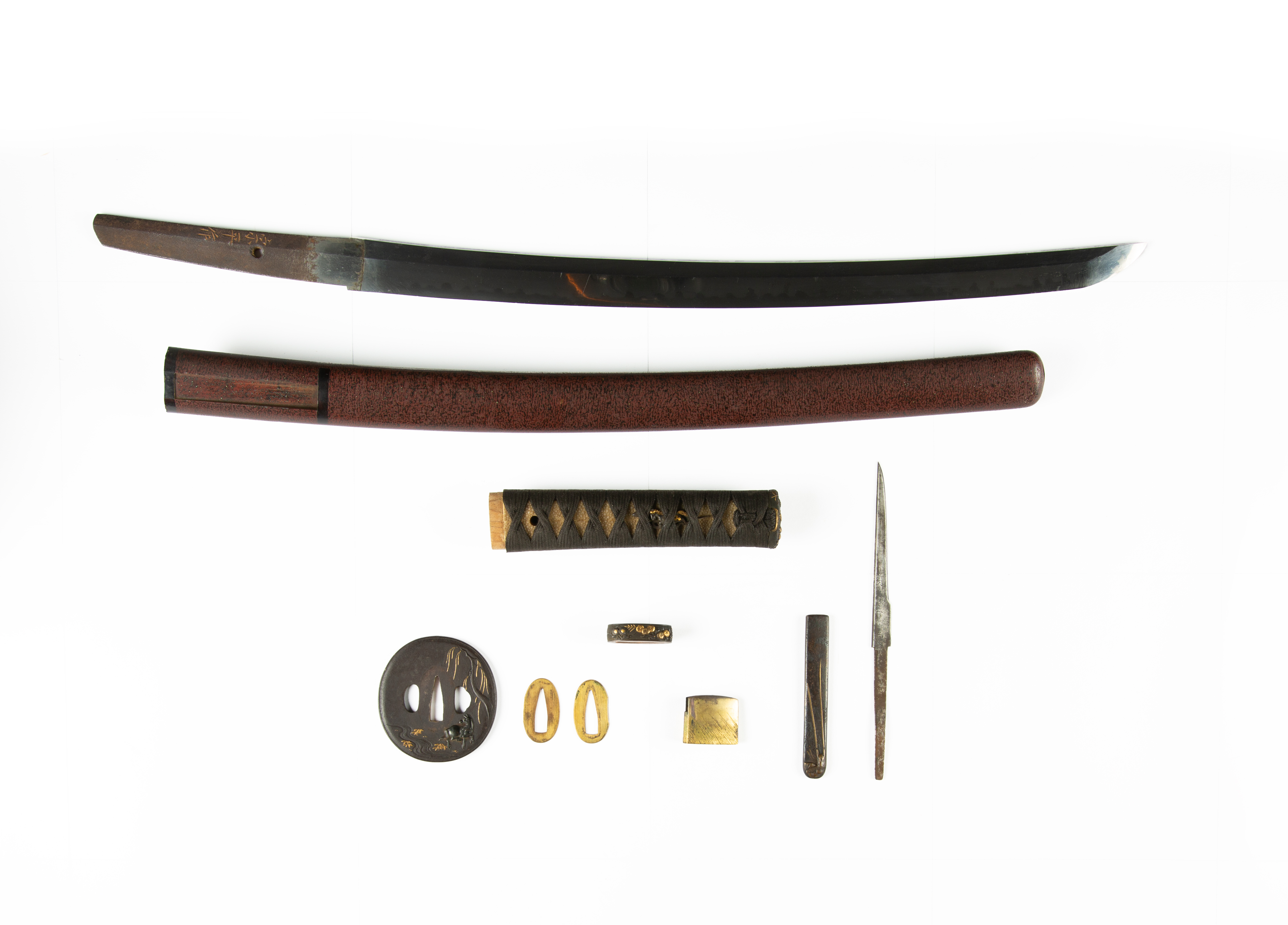 The mottled red lacquer scabbard with minute sprinkled aogai details, the fuchi-kashira decorated with flowers and with a grasshopper on the pommel, each menuki modelled as a prancing horse with details in gilt; the iron tsuba also embellished with a shakudo stallion under a willow tree and by a stream; the handle of the kozuka with a lobster, the blade with an inscription possibly reading Seki Kane...; the tang of the blade with mei reading as Munehira saku; the blade 62.3cm. (2)