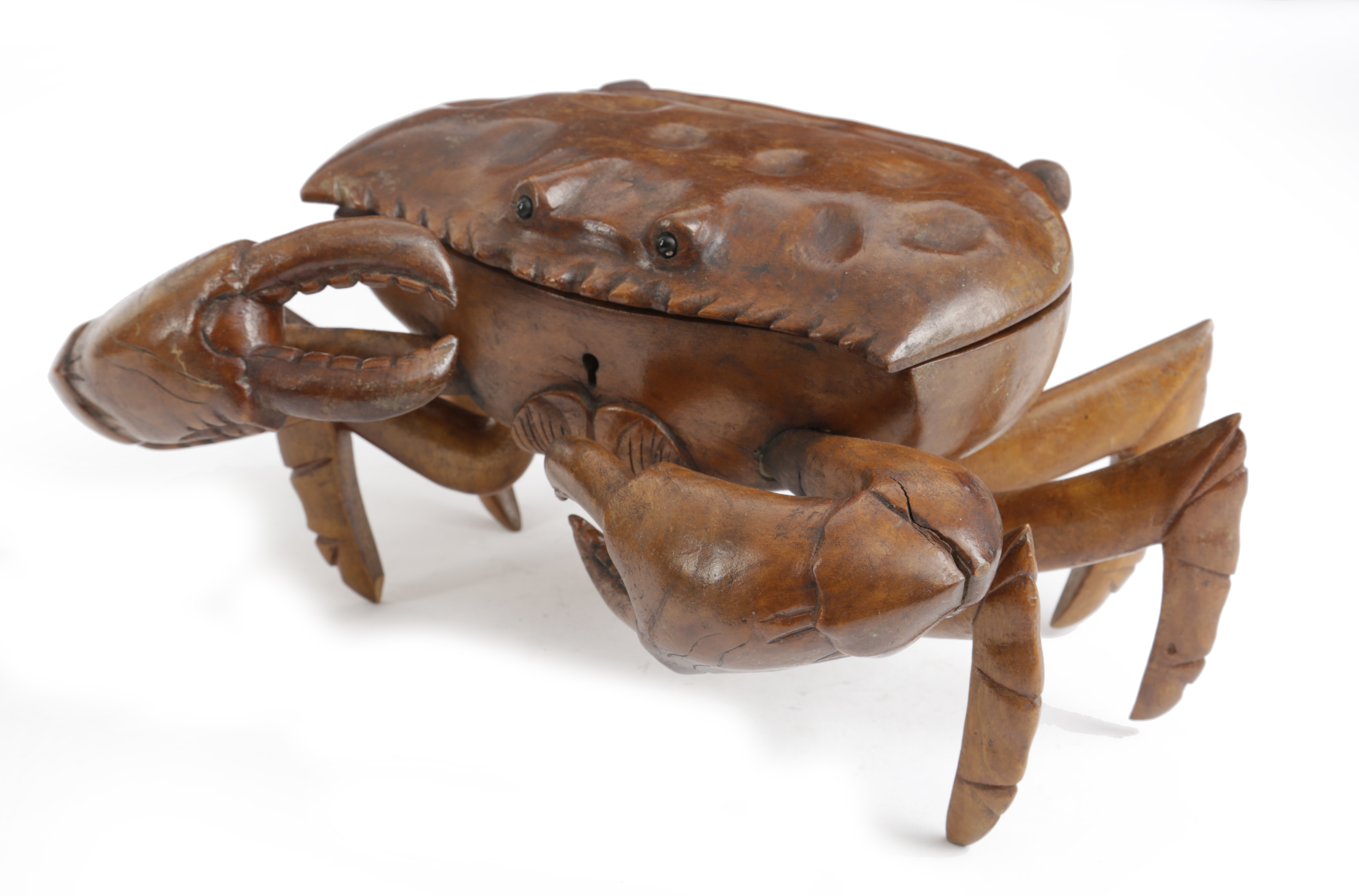 Possibly Japanese, realistically carved and with glass eyes, the hinged lid opening to reveal a velvet-lined interior; together with a key, 34cm. (2)