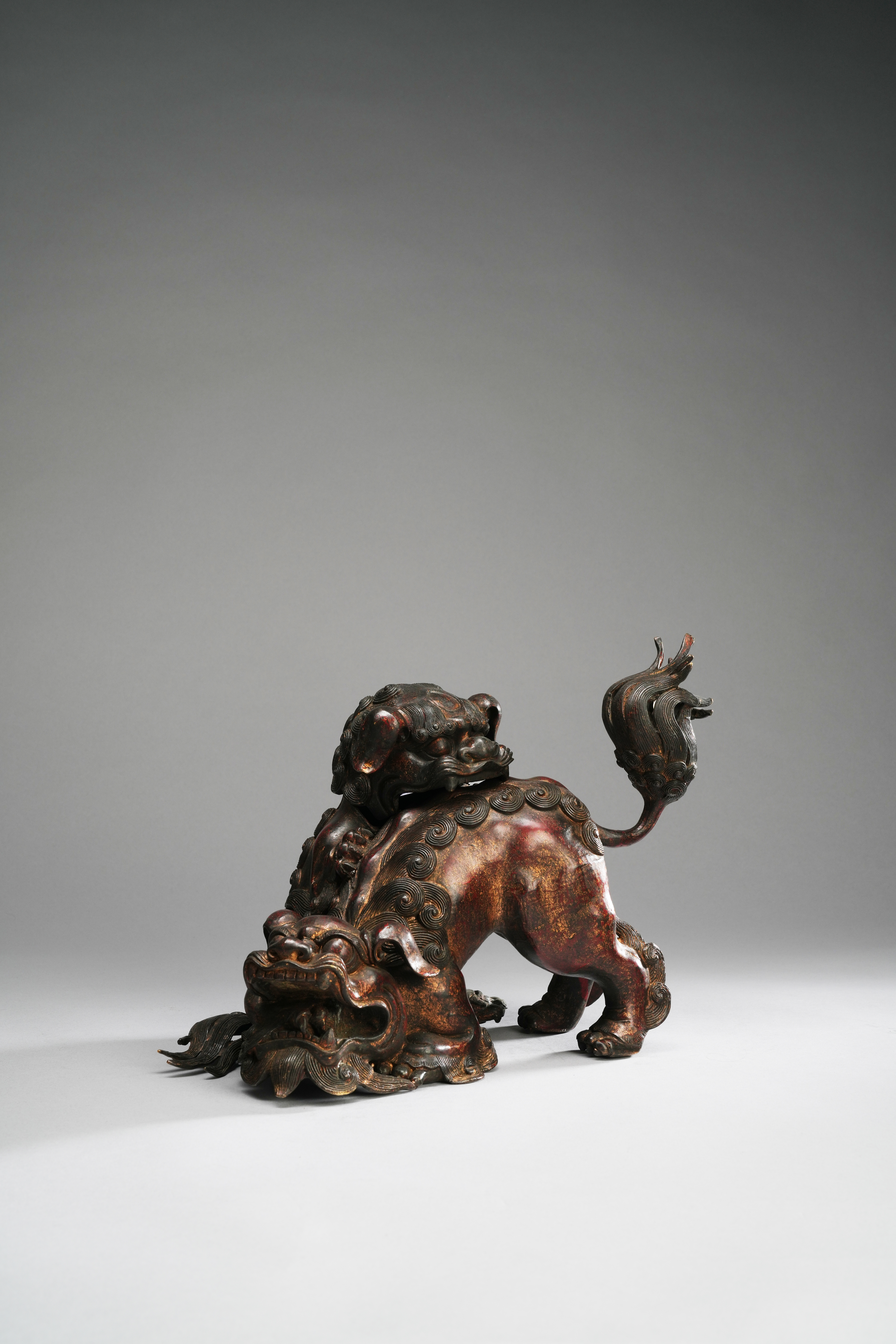 Cast as two shishi playfighting, one biting the back of the other, its head removable; with traces of gilding; 37cm. (2)