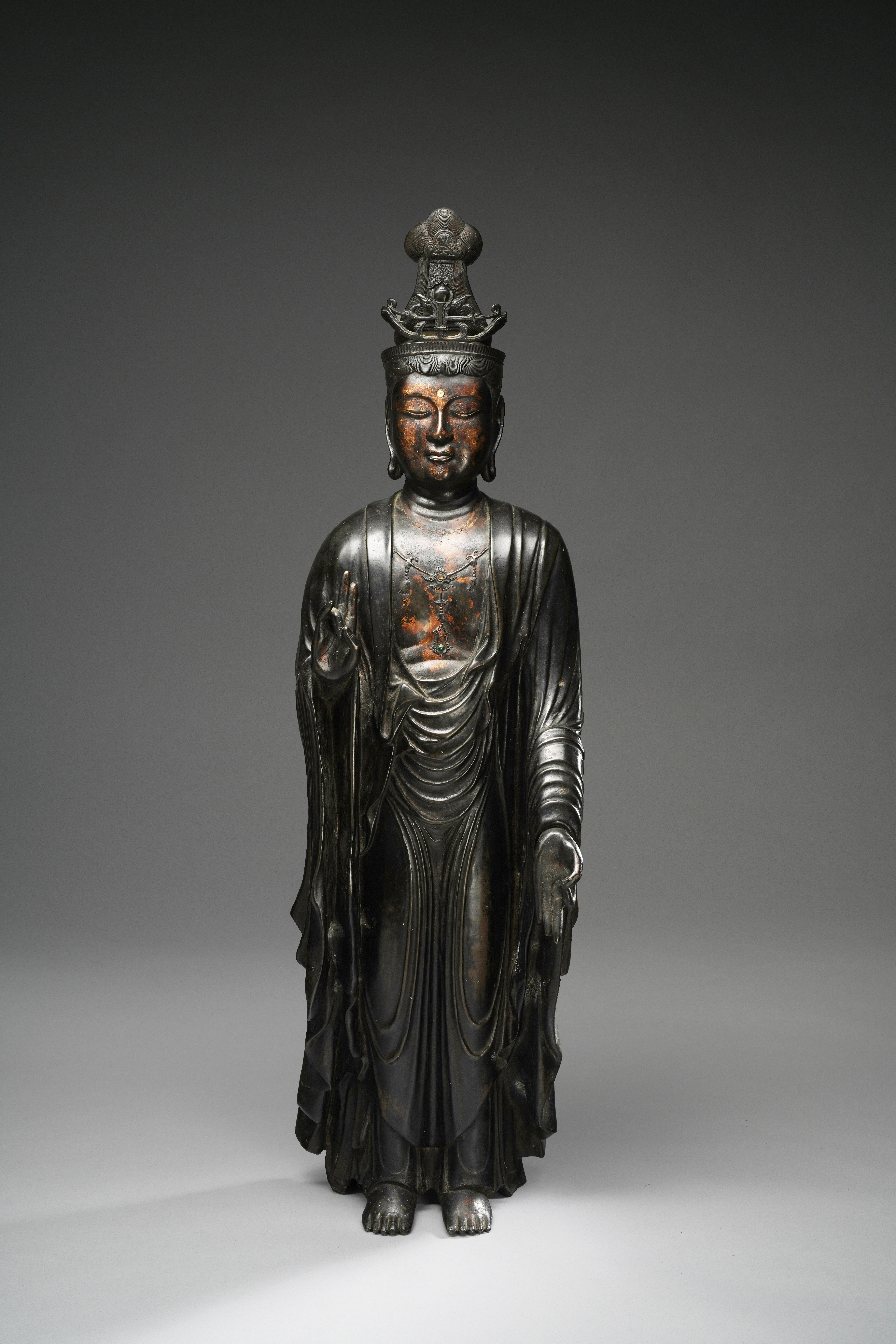 The impressive and heavy Bodhisattva of Compassion depicted standing, barefoot and with long flowing robes revealing her chest, with bejewelled necklaces with malachite inlays and an elaborated headdress; the hands depicted in kichijo-in and an-i-seppo-in; with a long inscription at the back reading as 'Kozuke no kuni, Nitta, Kanayama jo sanroku, Mannen san Sogen-ji, Minamoto Yoshisada kufu su' (Donated by Minamoto Yoshisada, the Sogen-ji Temple of the Mannen mountain, located at the foot of Kanayama Castle, Nitta, Kozuke Province)', 95cm.