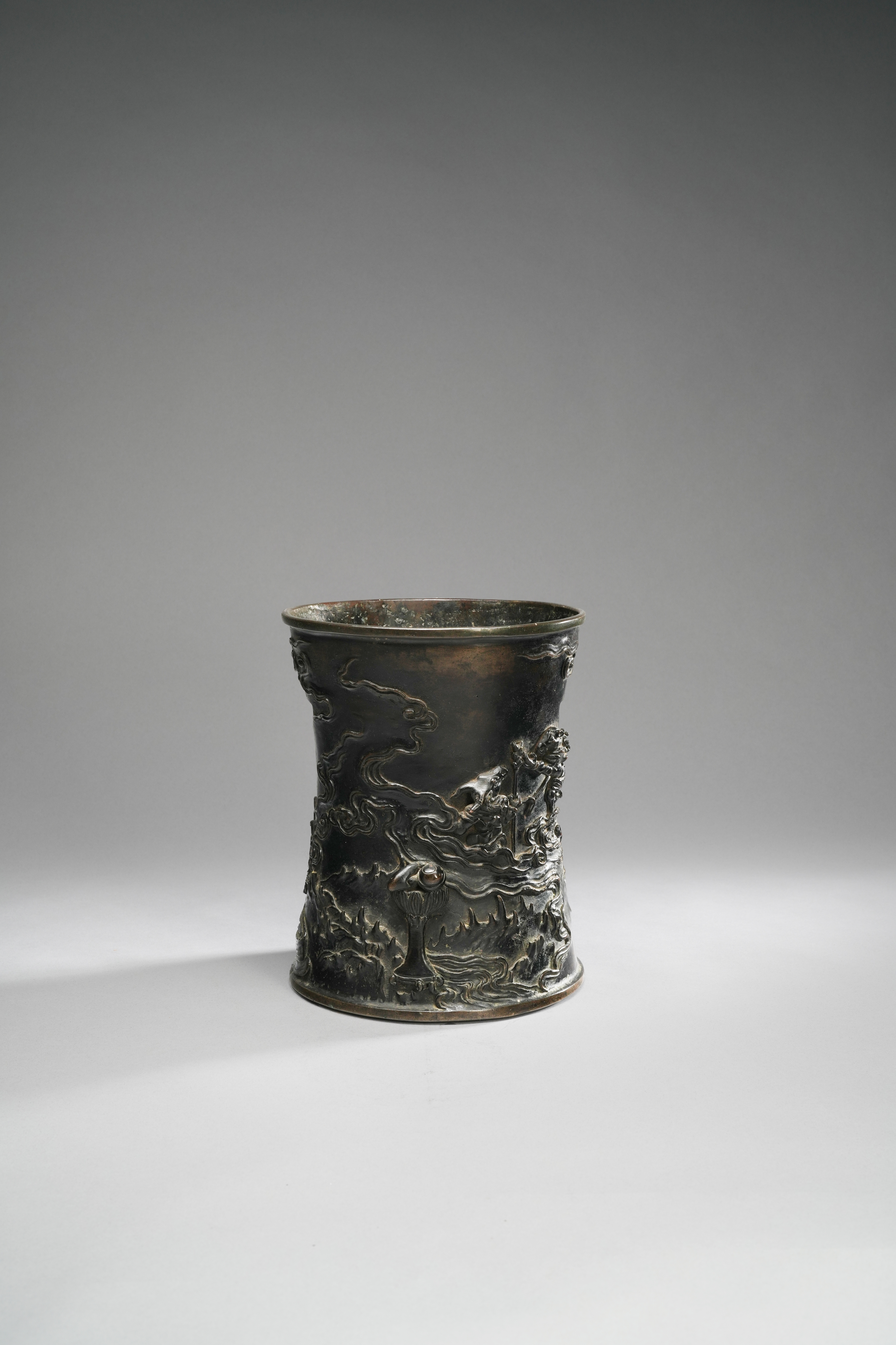 Of tall waisted shape, decorated in relief with an unusual scene set in Buddhist Hell, with the horse and ox-headed demons Mezu and Gozu overseeing the infernal landscape, a stream meandering beside them amongst jagged rocks and scrolling mist; the reverse with a man carrying a large stele of the Buddhist Triad over his back; unsigned, 25.3cm.