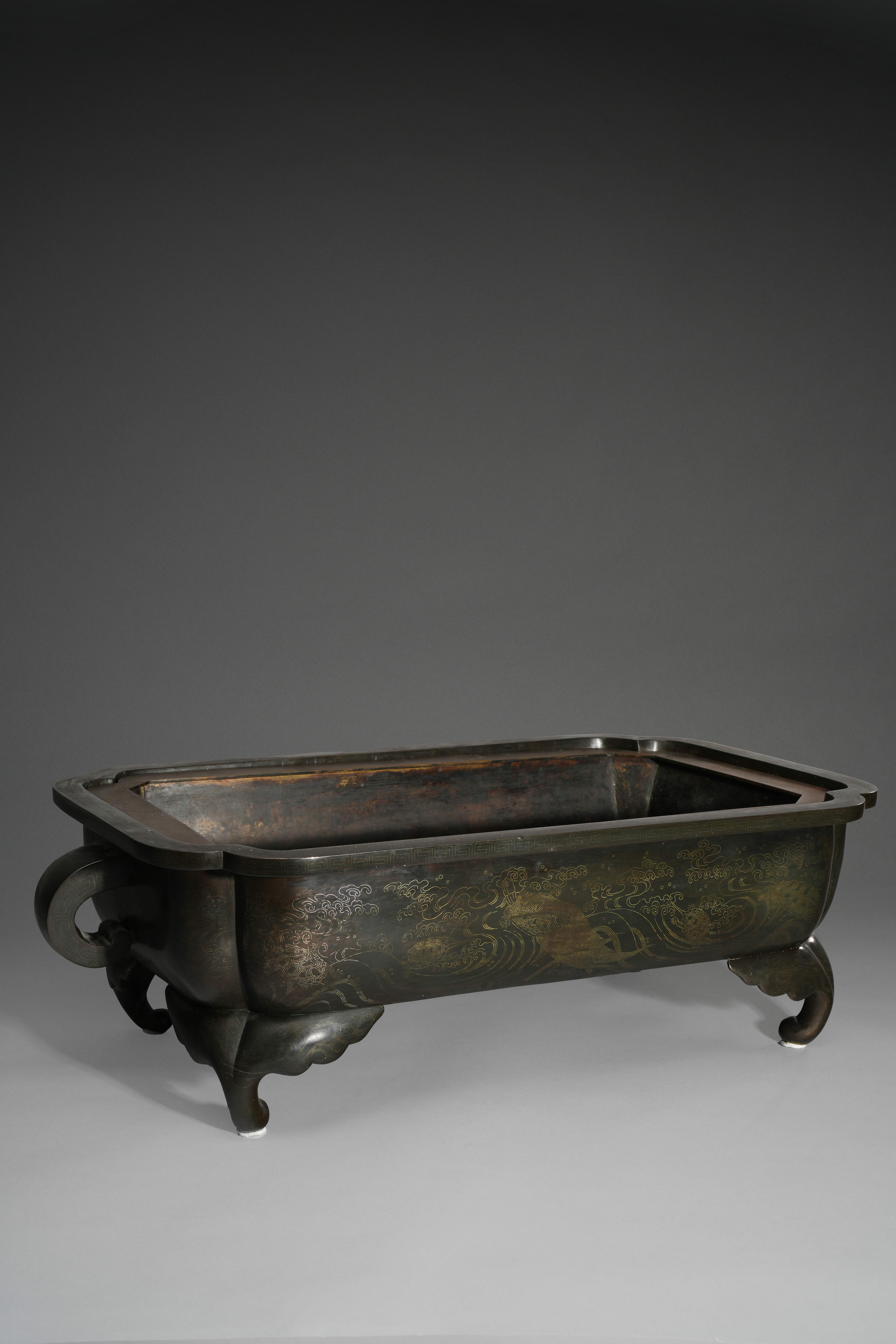 The rectangular body raised on curled feet and with scrolling handles, the sides decorated with a continuous scene depicting minogame, the mythical turtles amongst crashing waves; the rim with a border of four-petalled flower mon, all rendered in inlaid wires; together with an inner liner, 21cm x 69cm x 39.5cm. (2)