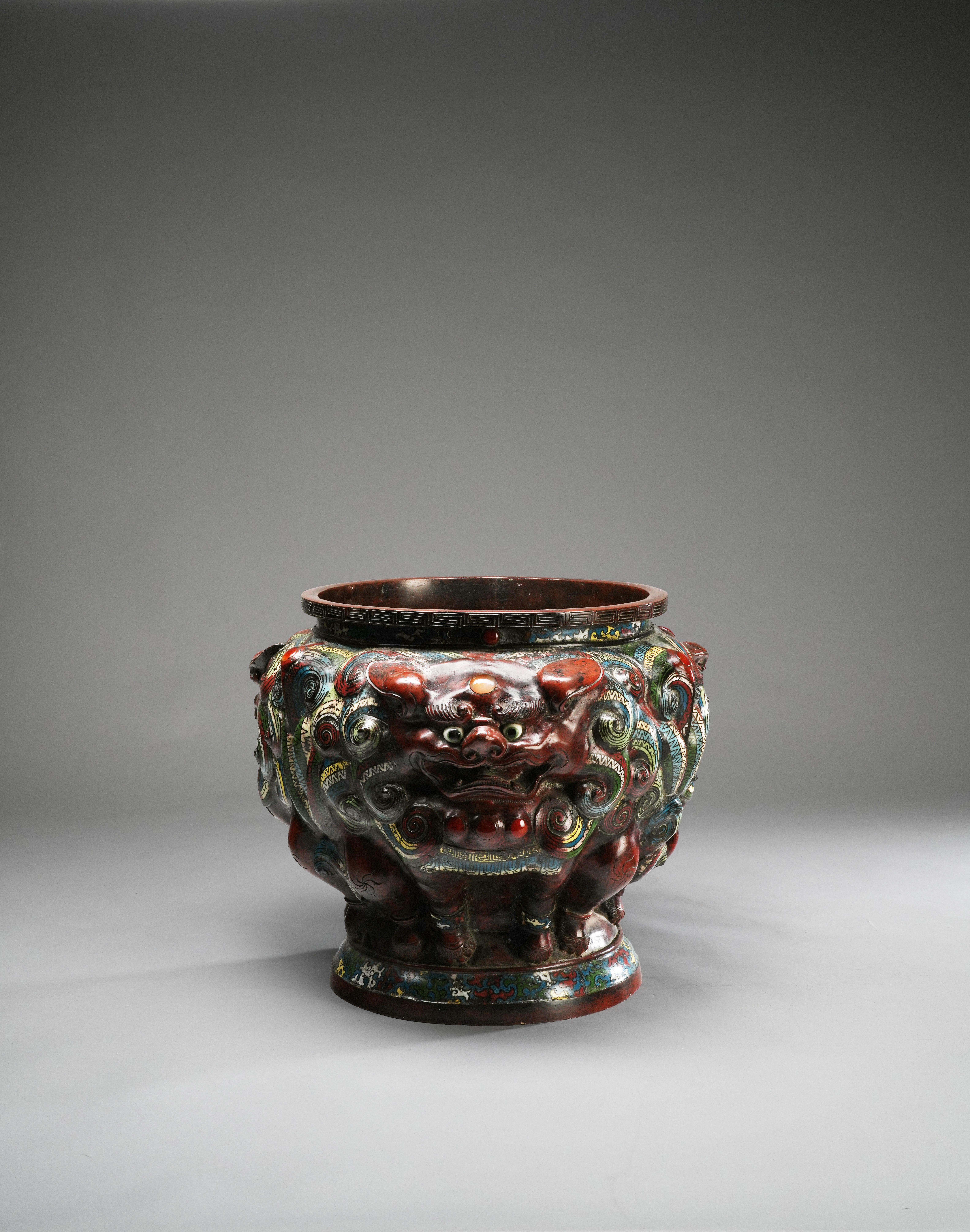 The ovoid body cast with three ferocious-looking shishi, the lion dogs with inlaid eyes and stone cabochons; with large areas decorated in colourful cloisonné and the rim with a key-fret border; marked underneath, 36.5cm.
