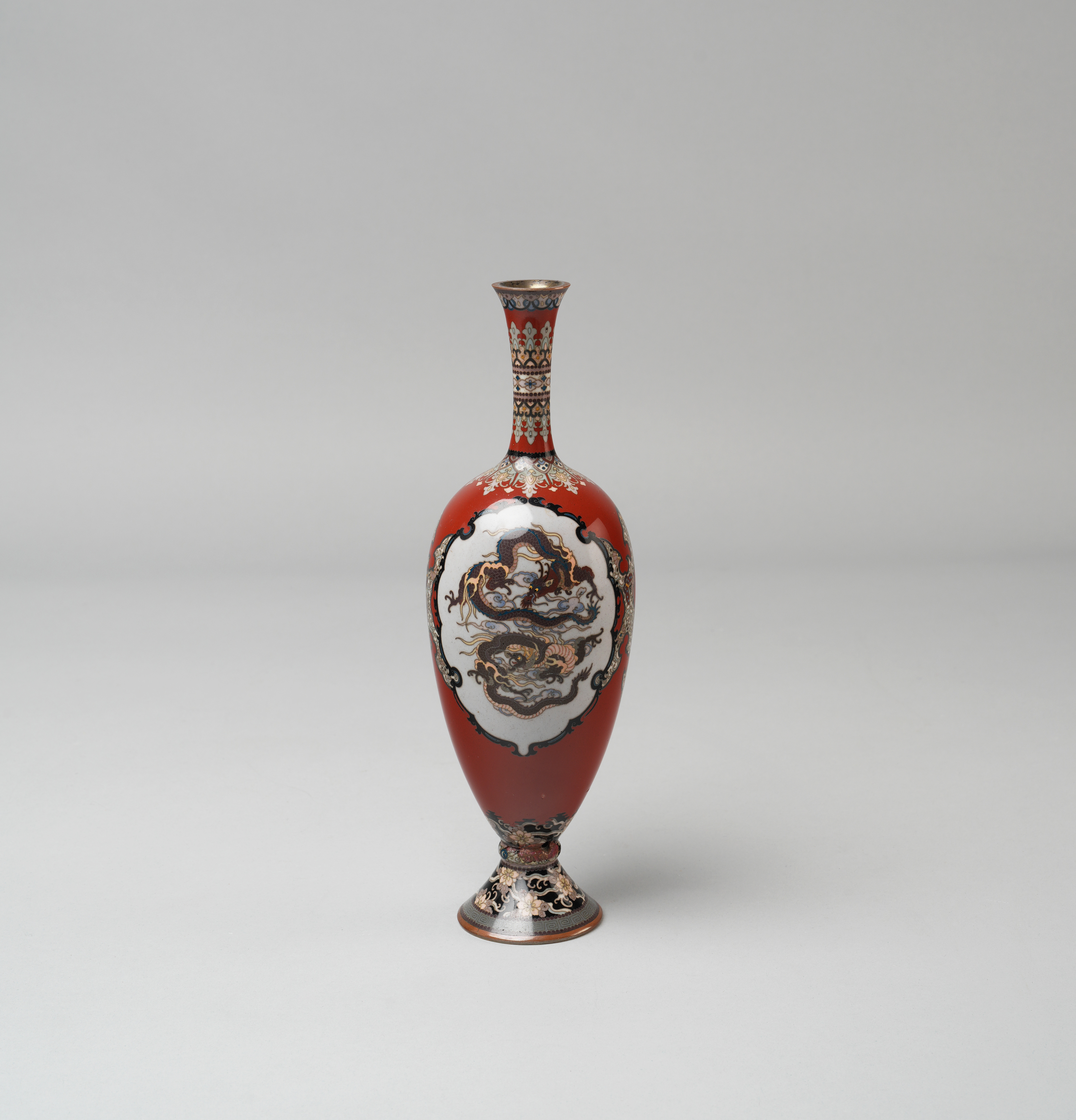 The elegant slender body decorated with ornate panels on a coral-red ground enclosing ho-o birds and dragons, in between borders of formal designs, 25cm.