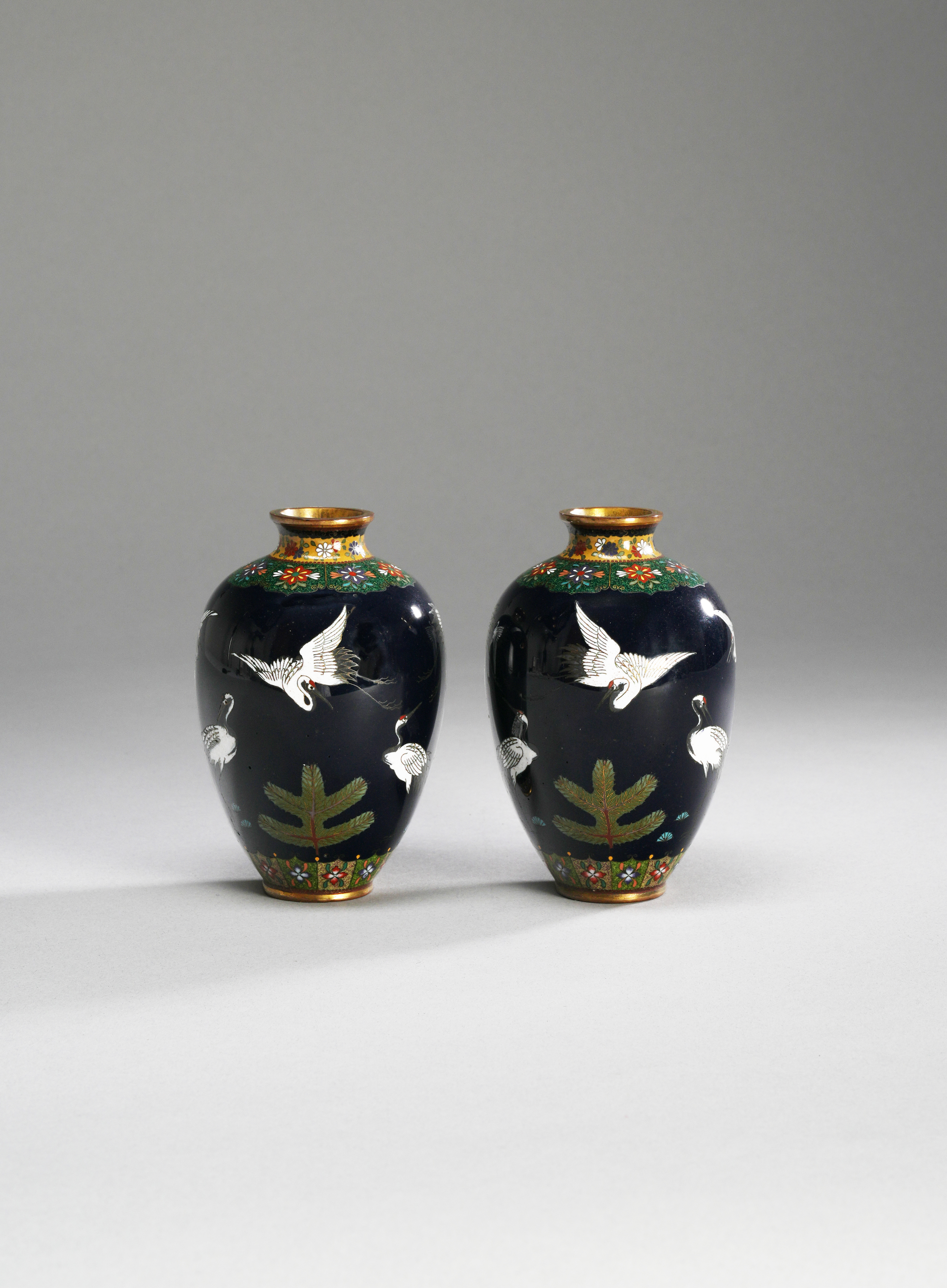 The ovoid bodies decorated with cranes in flight and beside large pine branches, in between borders of lappets enclosing flowerheads; both 12.3cm. (2)