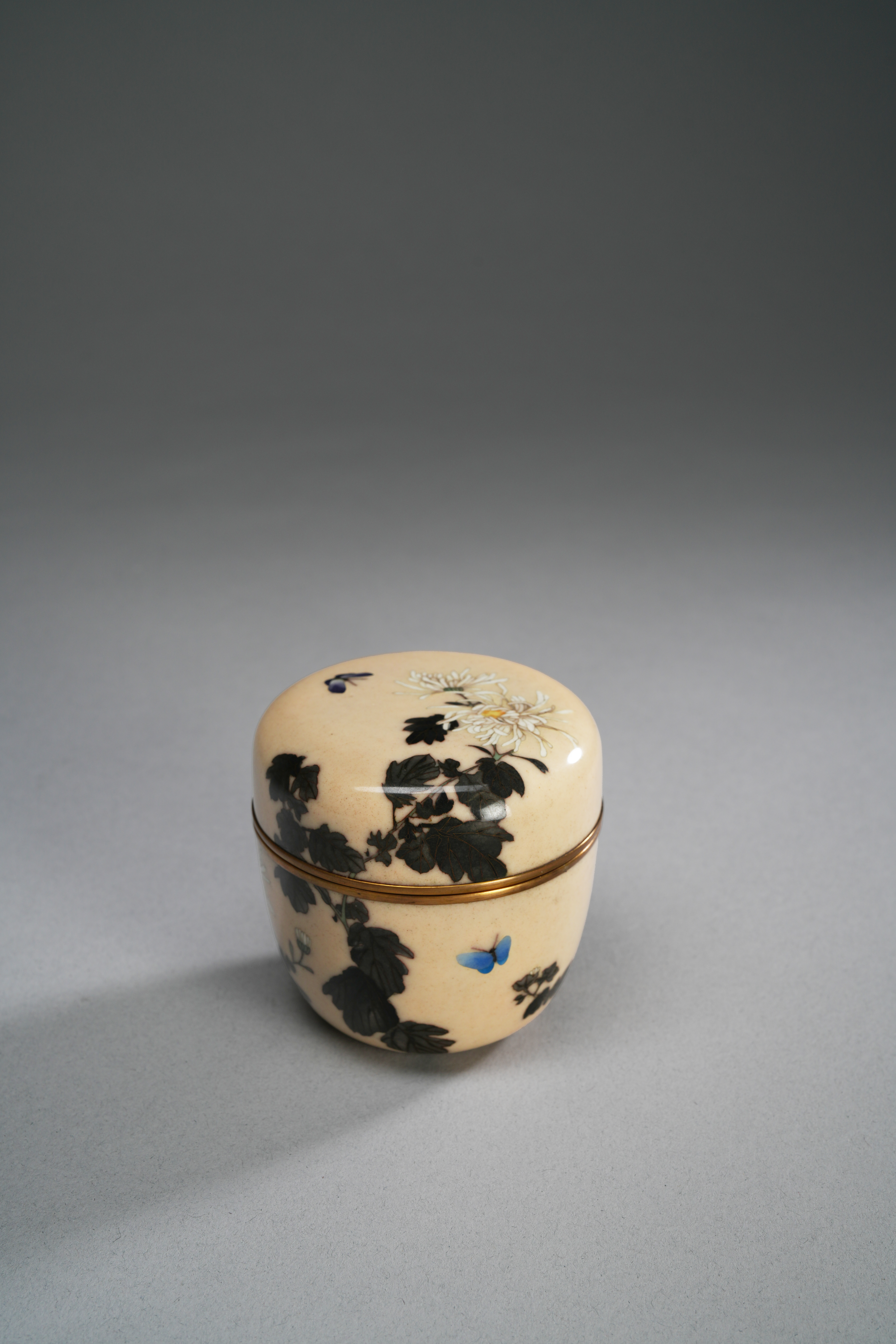 The ovoid body with a flat cover, delicately decorated with small butterflies fluttering amongst sprays of pink and white chrysanthemum, on an unusual creamy-pink ground; the inside gilded and the base with the cloisonné mark for Namikawa Sōsuke, 7.5cm. (2)