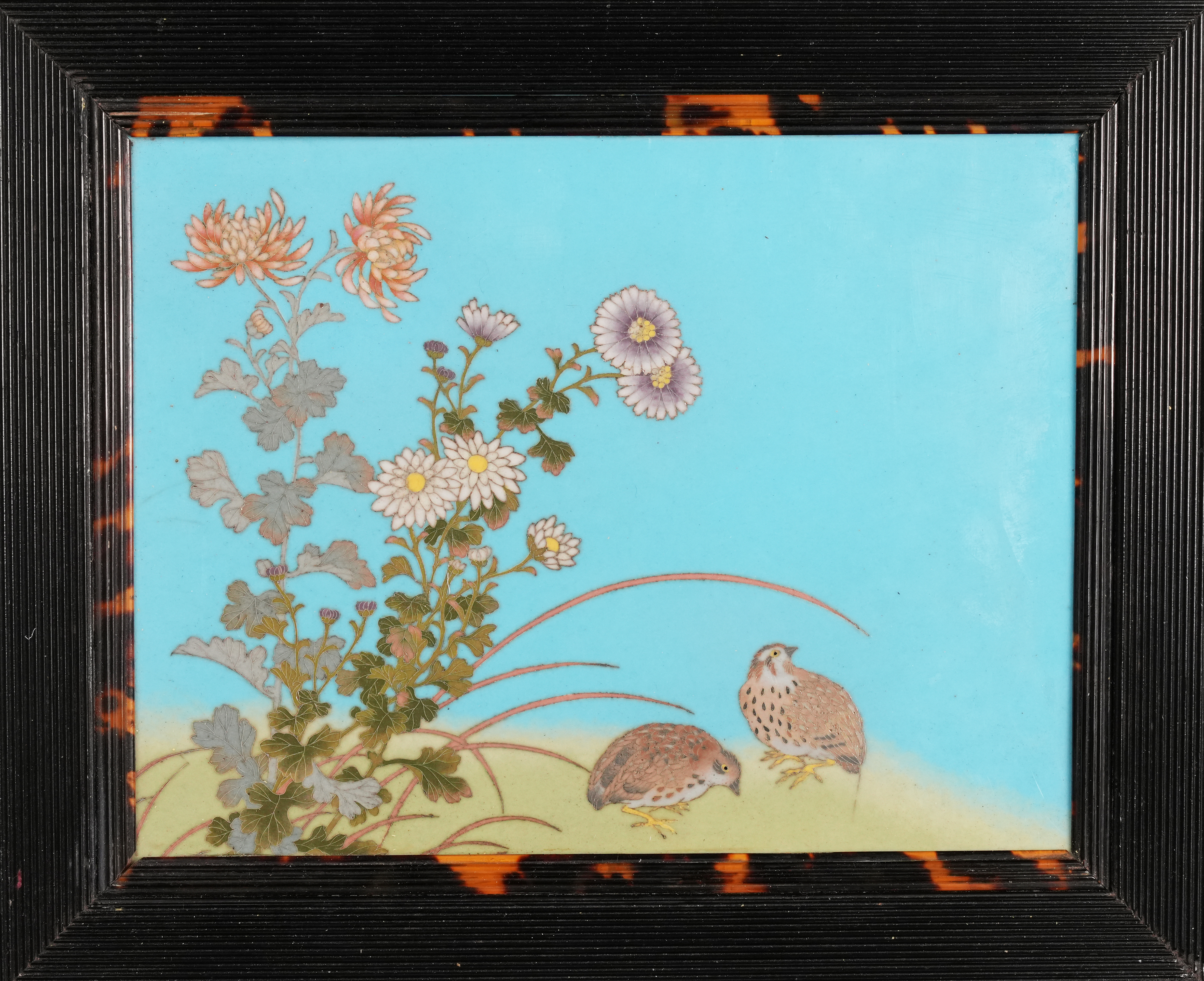 Of rectangular form, with two small quails underneath flower sprays on a bright blue ground, the reverse with fish scale pattern; mounted in a frame with tortoiseshell border, the panel 13.7cm x 17.8cm, 19.2cm x 23.2cm overall.