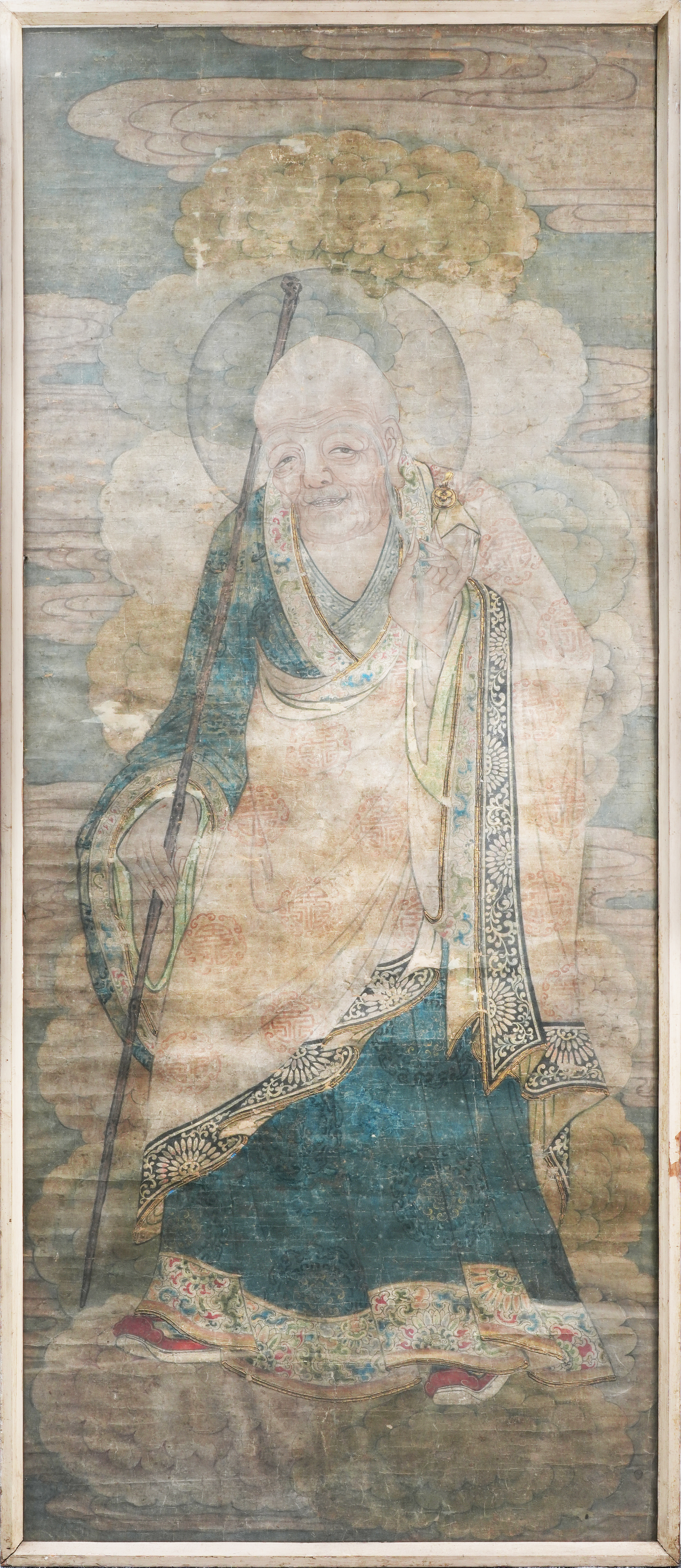 A Japanese kakejiku (hanging scroll painting), ink, colour and gold on paper, depicting one of the legendary disciples of the historical Buddha descending from the heavens amongst clouds, portrayed as an elderly man wearing ornate robes, his left hand raised in a gesture of blessing and holding a staff in the other; framed and glazed, with a paper label at the back for 'The Berkeley Galleries, William F C Ohly, 20 Davies Street, London W1'; the painting 160cm x 67cm.