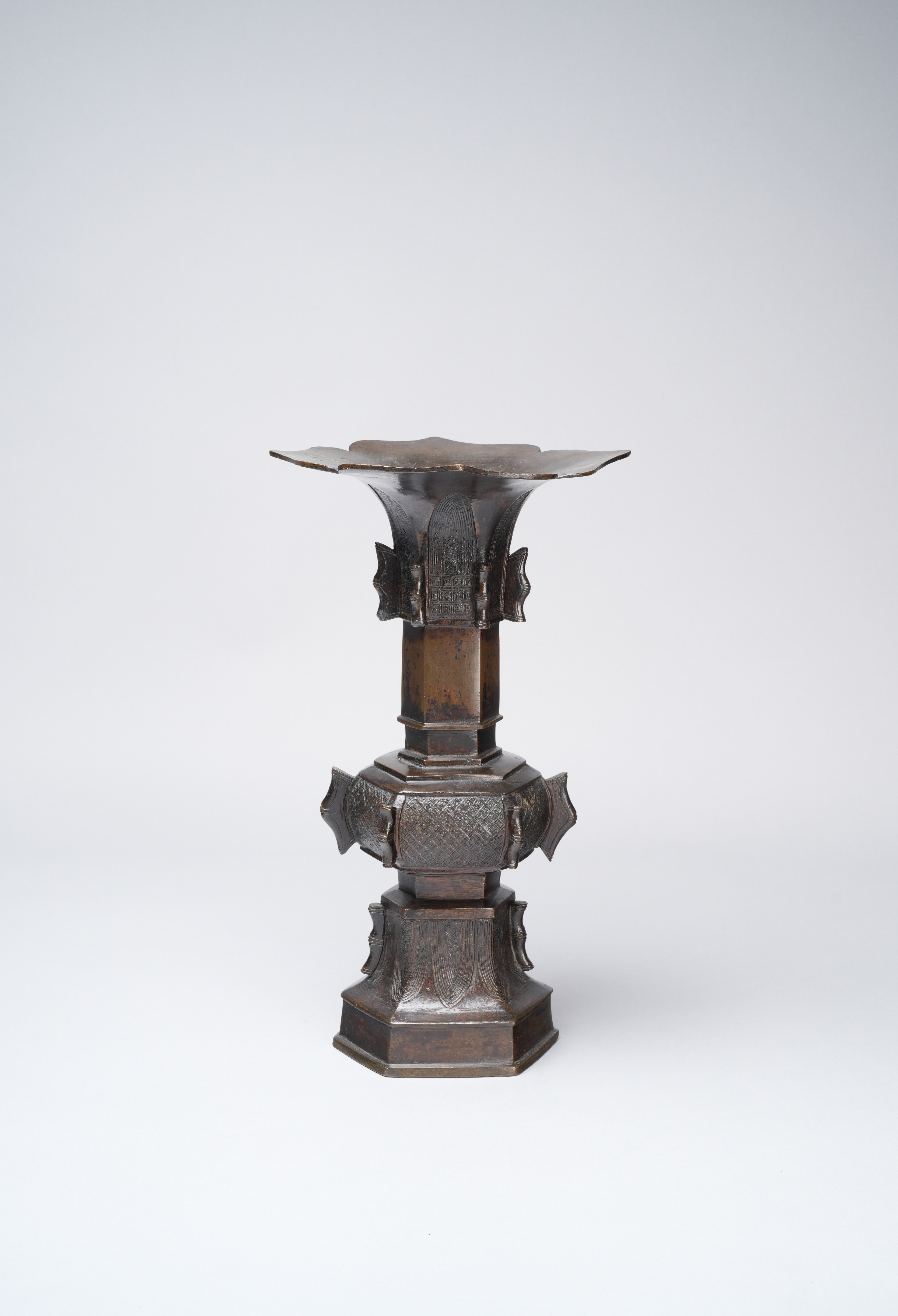 Of hexagonal section, with a flared foliate rim above the tall neck decorated with lappets and bamboo-shaped flanges, the central section decorated with wan diaper divided by further flanges, raised on a tall foot, with a paper label for the Finer Collection 'CB 45', 3kg, 37cm.